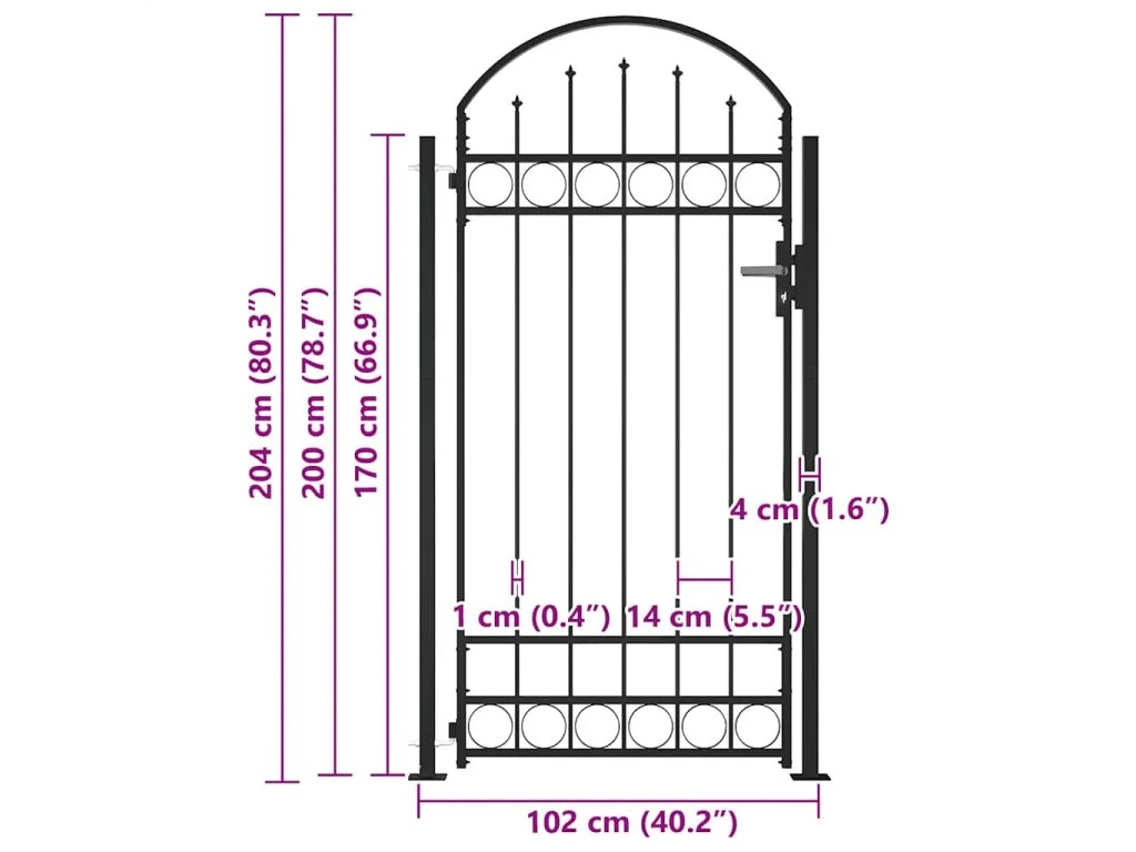 Branka má elegantní design s dekorativním obloukem ve své horní části a její silné horizontální příčky zpevňují rám. Branka vytváří krásný a zároveň bezpečný vstup na váš pozemek. Je vyrobená z vysoce odolné oceli a opatřená práškovým nástřikem proti rzi a korozi.