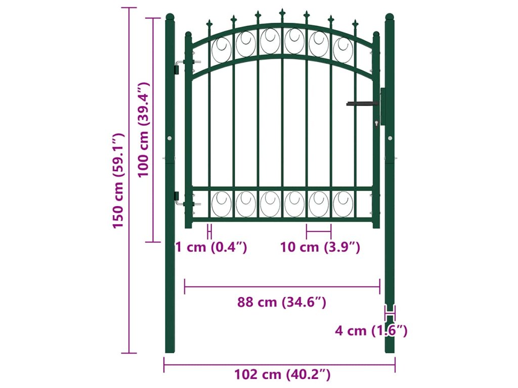 Plotová branka je vyrobená z vysoce odolné oceli, má robustní konstrukci s práškovým nástřikem proti rzi a korozi. Zahradní branka je vybavená vertikálním pruty zakončenými hroty a silnou vodorovnou výztuží, takže vám poskytne vysoký stupeň zabezpečení. Klenutý design jí dodává na eleganci. Součástí balení jsou dva pevné sloupky s robustními závěsy pro snadnou instalaci a také zámek se třemi klíči.