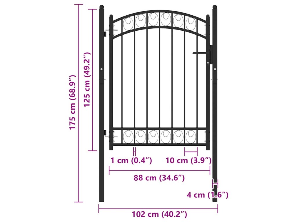 Elegantní zaoblený design naší branky je velmi atraktivní. Silné vodorovné příčky zpevňují její rám a zvyšují její bezpečnost. Branka tak tvoří působivý vstup na váš pozemek. Je vyrobená z vysoce odolné oceli a ošetřená práškovým lakem, který ji chrání před rzí a korozí. Zahradní branka je rovněž vybavena zamykacím systémem se třemi zahrnutými klíči. Dodáváme ji spolu se dvěma robustními sloupky s pevnými závěsy pro snadnou instalaci.