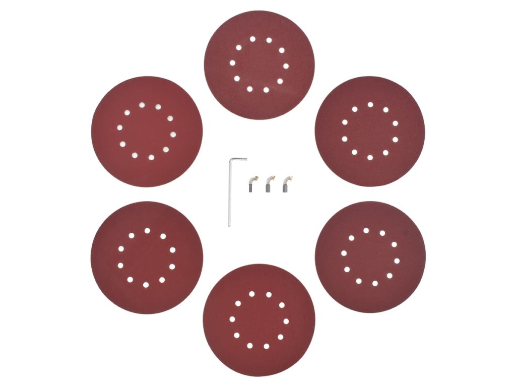 Příslušenství obsahuje 6 brusných papírových disků (80, 100, 120, 150, 180, 240 zrna), 2 uhlíkové kartáče, 1 hadici na prach, 1 šestihranný klíč a 1 sáček na sběr prachu.