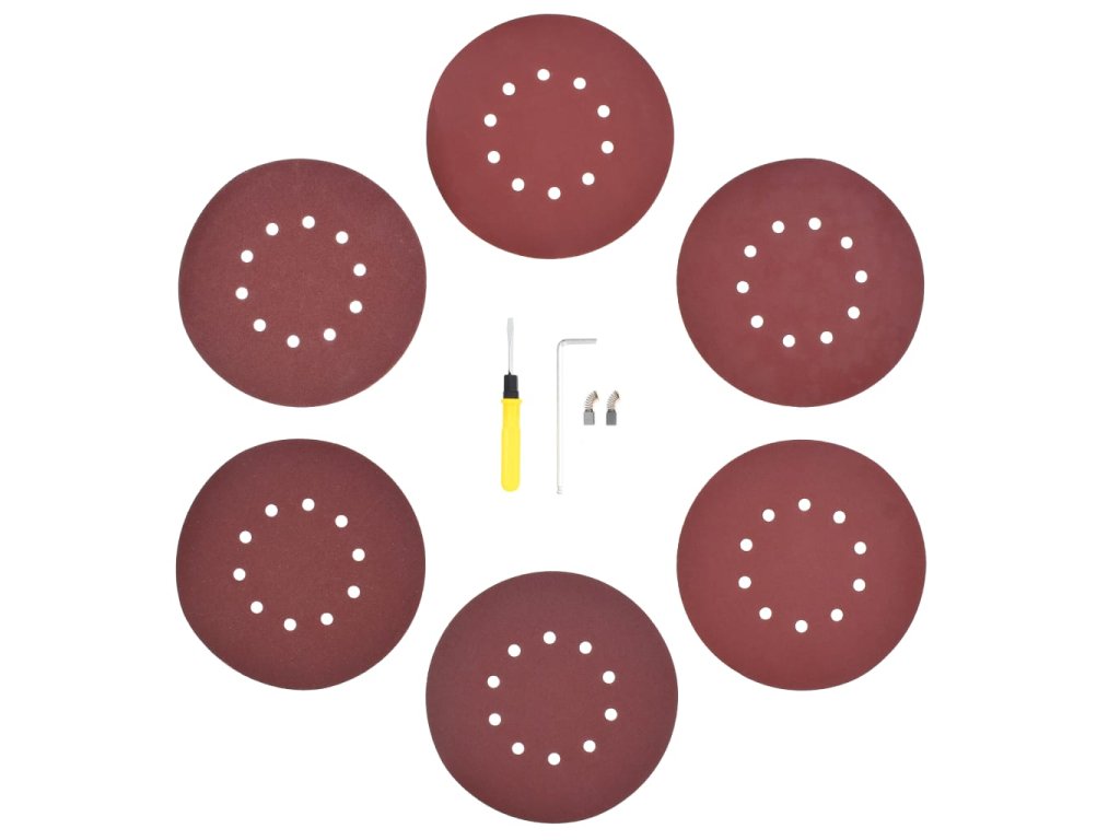 Příslušenství obsahuje 6 brusných disků (80, 100, 120, 150, 180, 240 zrna), 2 uhlíkové kartáče, 1 hadici na prach, 1 šestihranný klíč a 1 sáček na sběr prachu.
