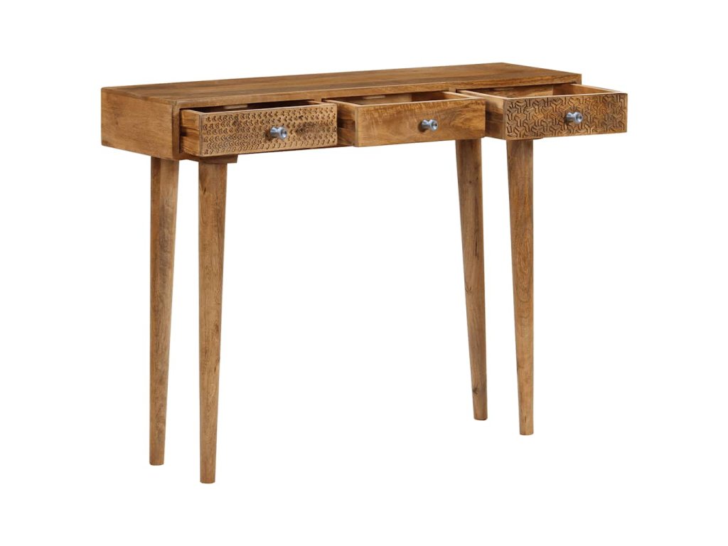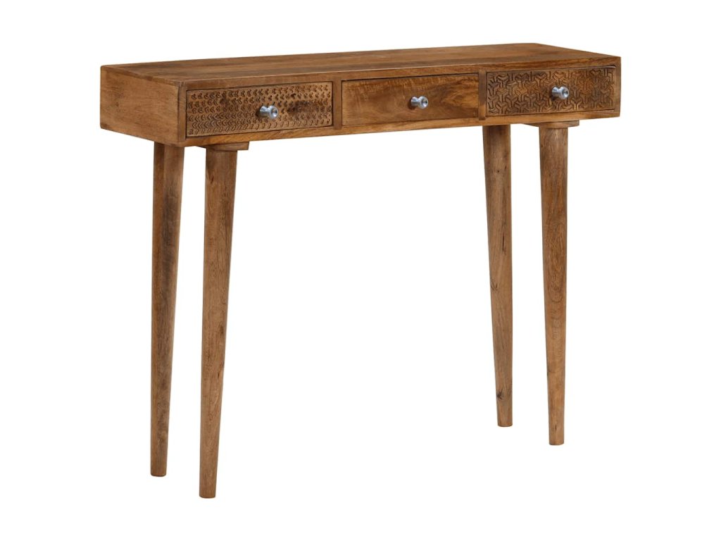 Stolek je vyroben z masivního mangovníku, a je tudíž velmi odolný. Jedná se o robustní, husté a tvrdé dřevo, které má na povrchu překrásnou hnědou nebo zlatou kresbu. Na pevnou desku si můžete vystavit dekorativní předměty, jako jsou vázy nebo květináče. Zásuvky vám poskytnou spoustu místa, kde si uspořádat nejrůznější věci. Zručně vyřezané ornamenty na přední straně zásuvky stolku propůjčují rustikální kouzlo. Každá fáze výrobního procesu je prováděna s mimořádnou péčí, ať už se jedná o leštění, natírání anebo lakování. Sestavení konzolového stolku je snadné.