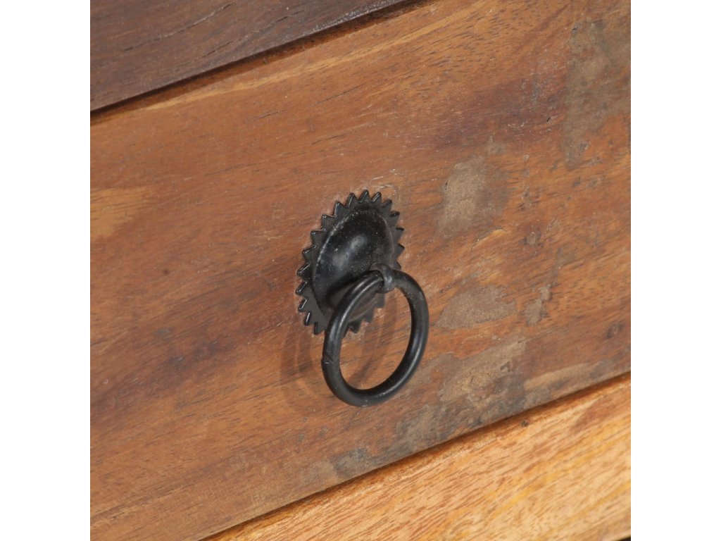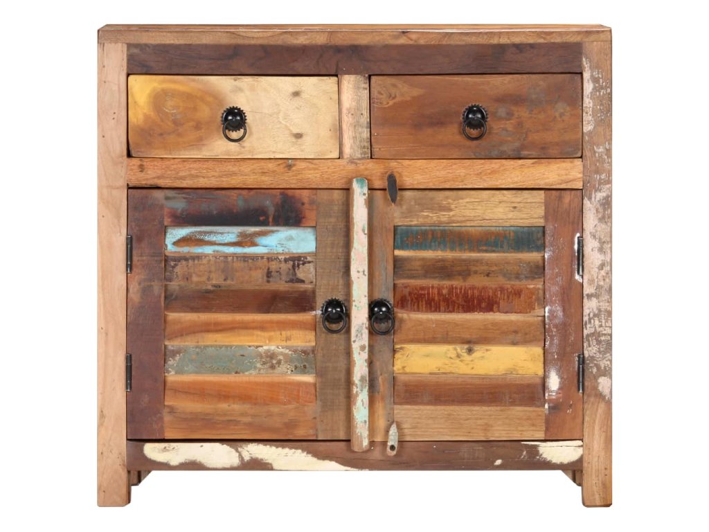 Tato úložná skříňka je vyrobená z masivního recyklovaného dřeva, které má vlastnosti různých dřev, jako je mangovníkové dřevo, teakové dřevo atd. Robustní horní deska je ideální místo pro vaše foto rámečky, vázy, ovocné koše nebo jiné dekorace. 2 zásuvky a přihrádka s 2 dvířky poskytují dostatek úložného prostoru, kde budou vaše věci chráněné před prachem a nepořádkem.