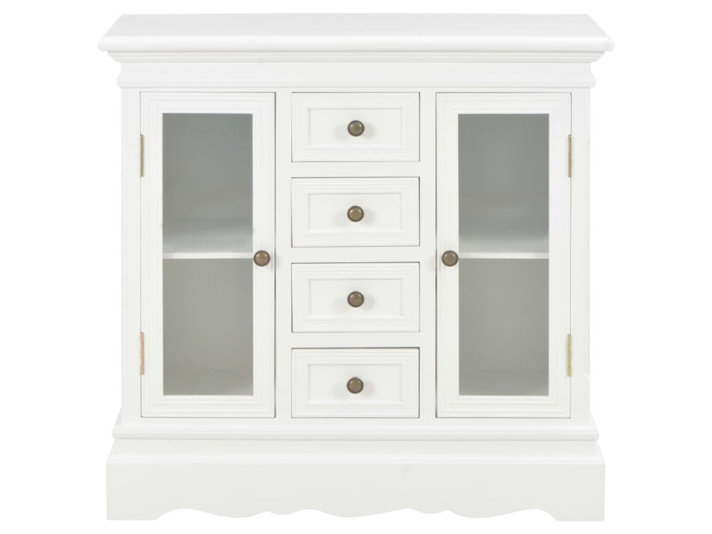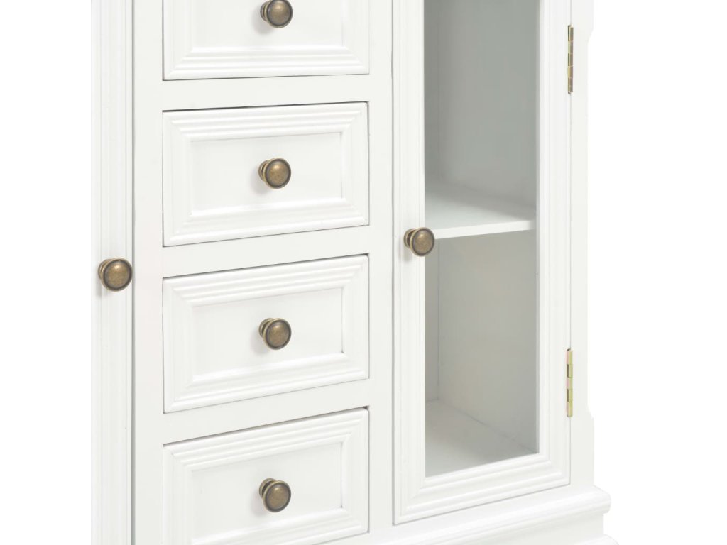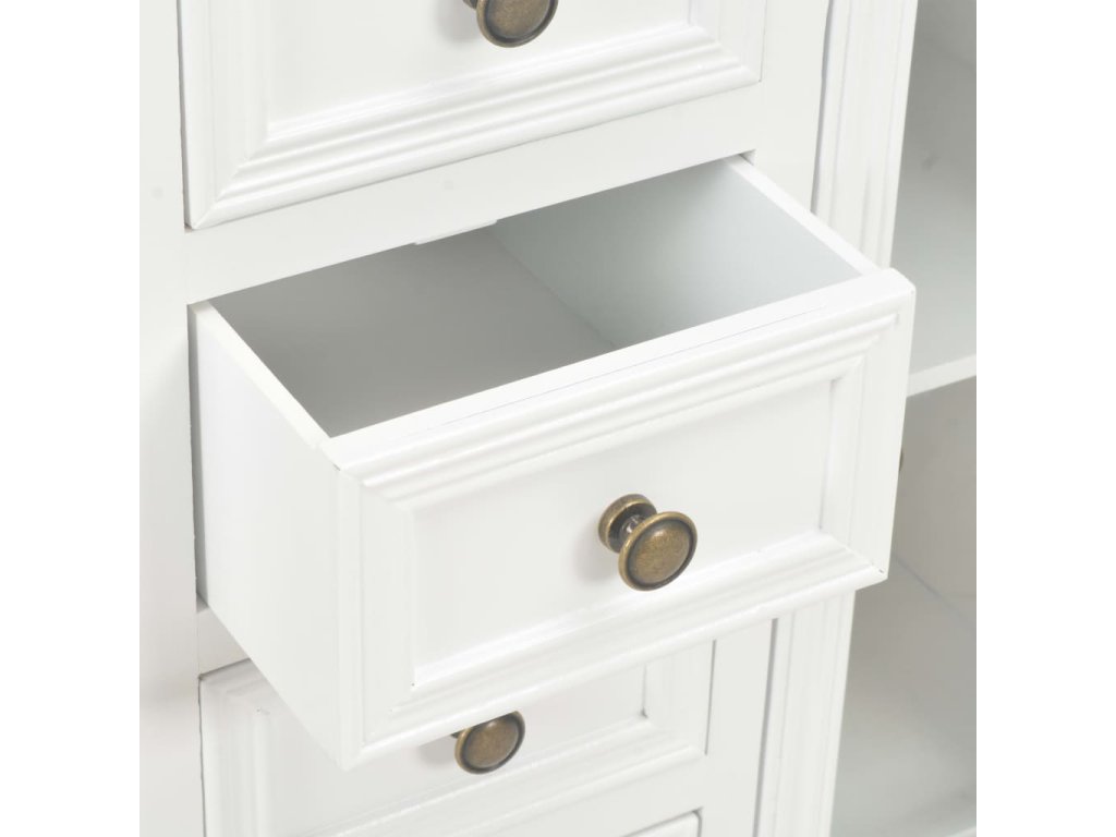 Odkládací skříňka je vyrobená z MDF a masivního borového dřeva, a proto je mimořádně robustní a odolná. Dřevěná skříňka má 4 zásuvky a 2 úložné přihrádky s akrylovými dvířky, takže vám poskytne dostatek úložného prostoru. Klasické knopky podtrhují půvabný vintage styl této úložné skříňky. Produkt se snadno sestavuje.