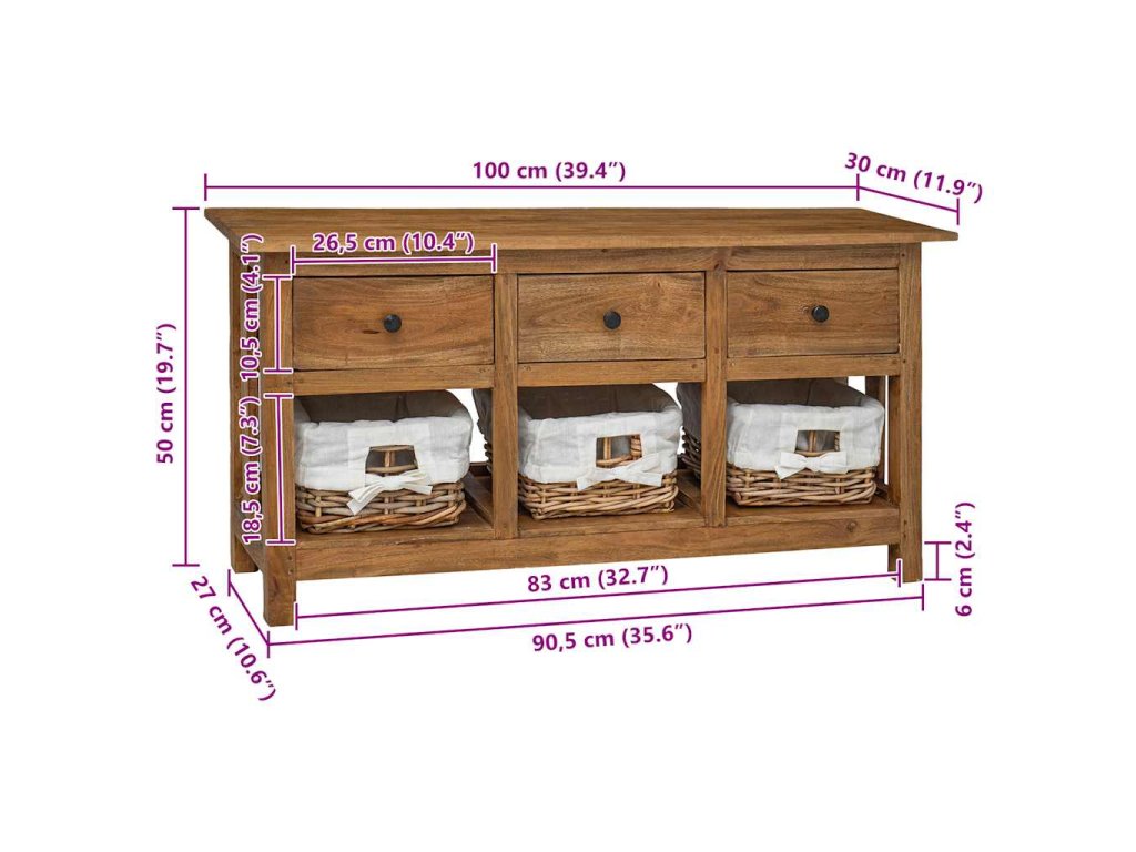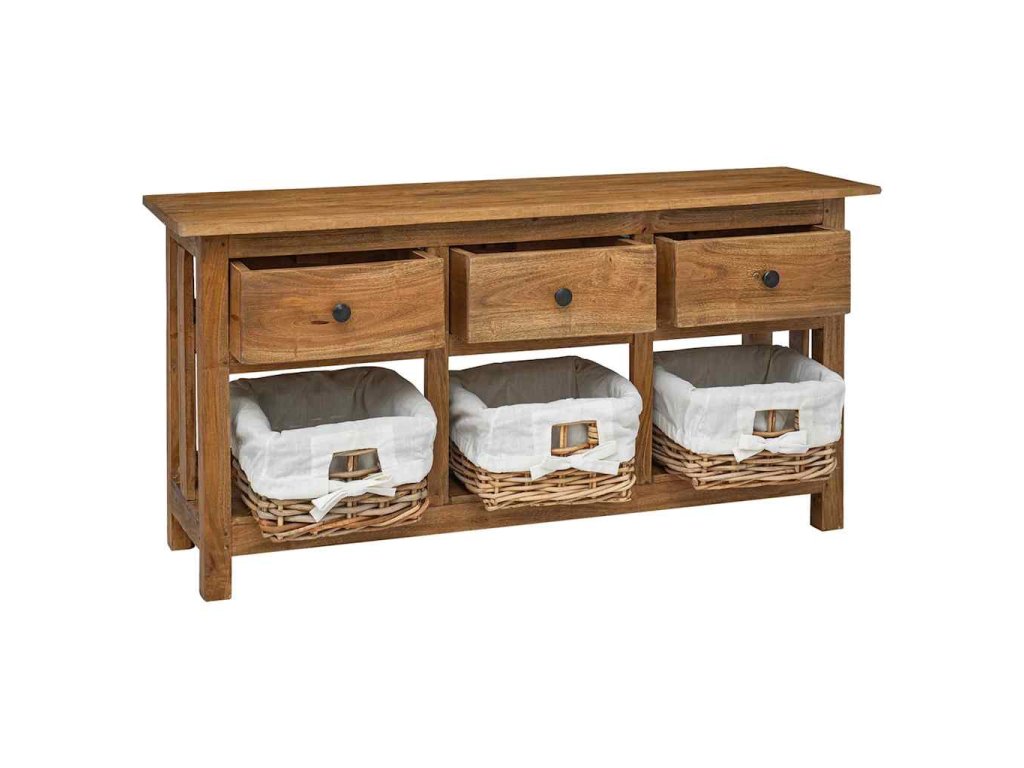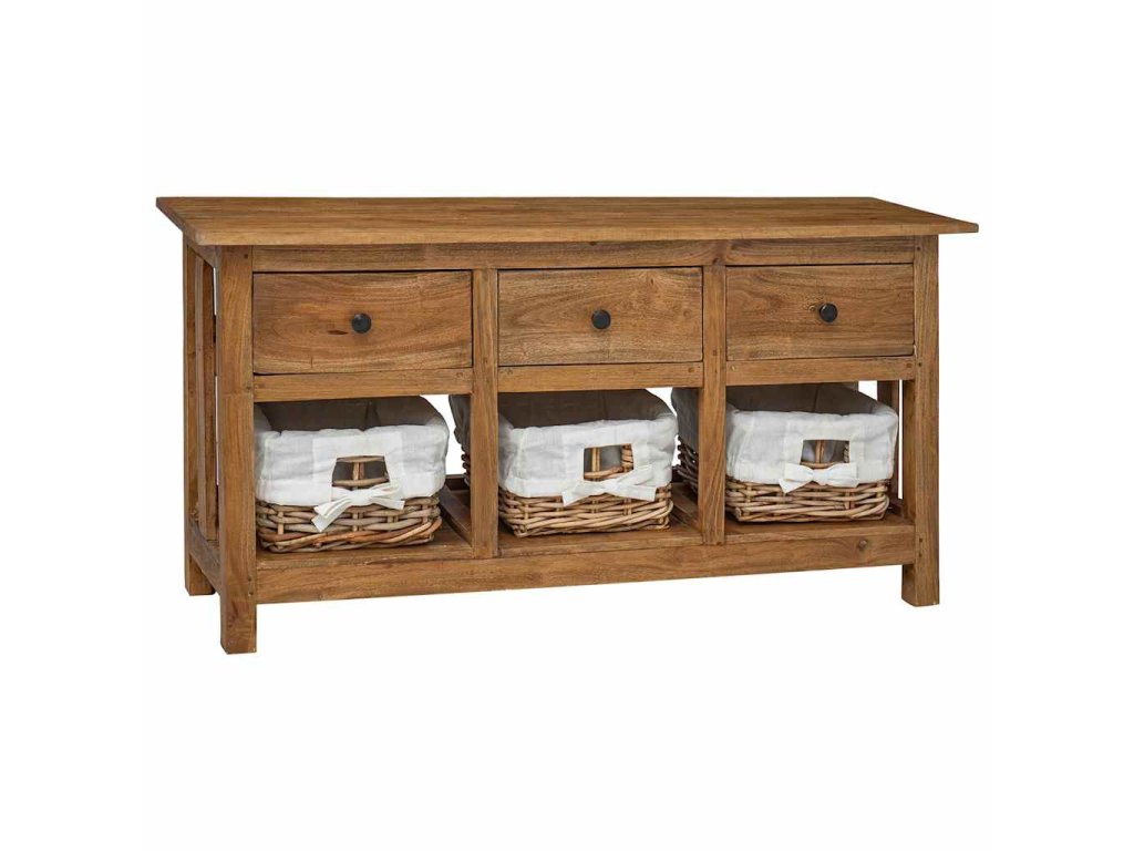 Tento příborník vnese do vašeho domova rustikální šarm. Je vyroben z masivního recyklovaného dřeva a známky opotřebení dodávají každému kusu jedinečný vzhled a propůjčují mu působivý vintage styl. Má 3 zásuvky a 3 vyjímatelné ratanové košíky.