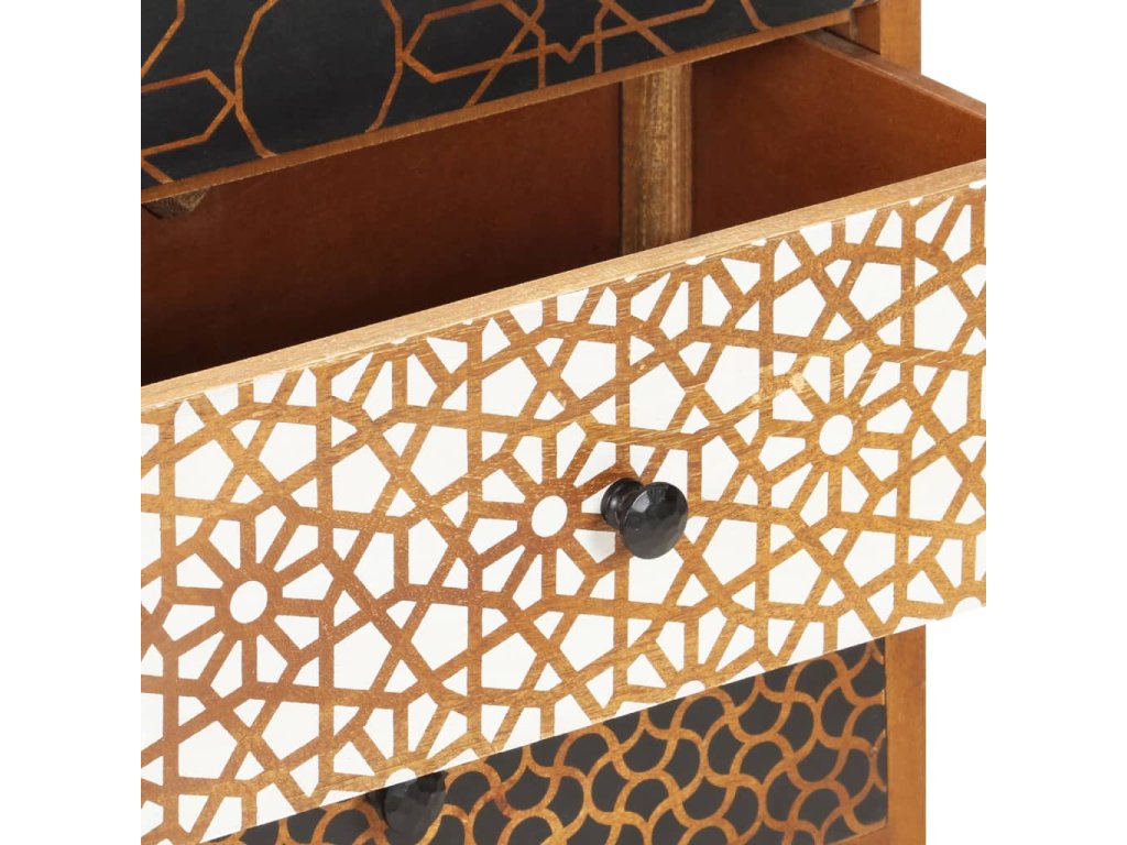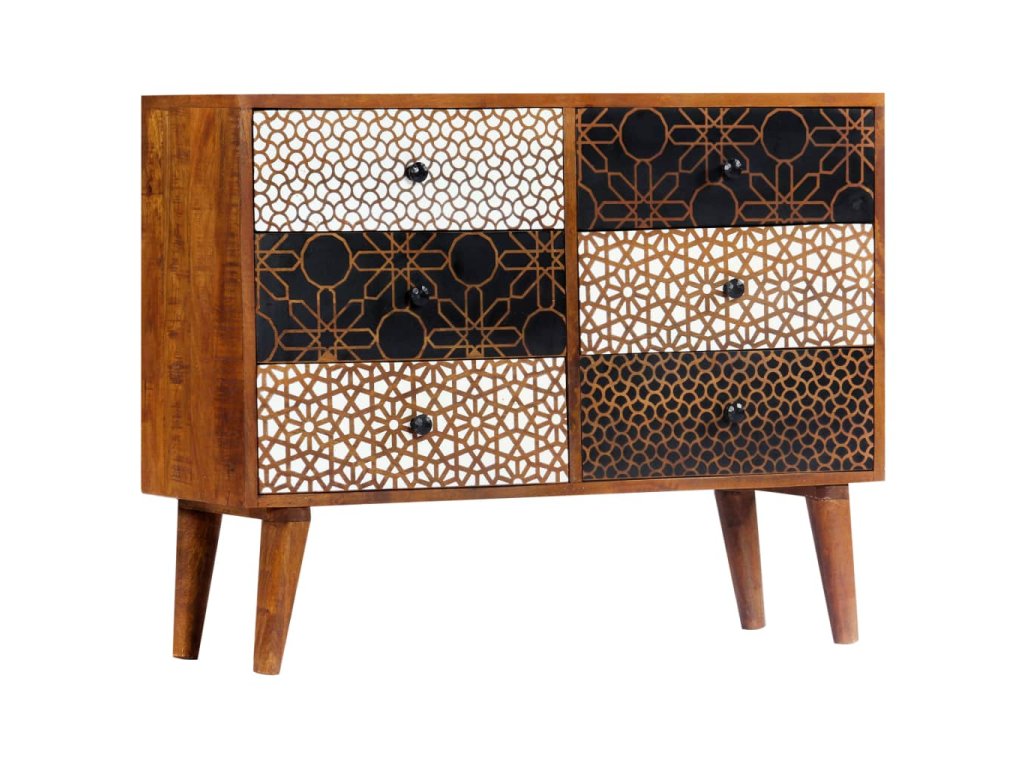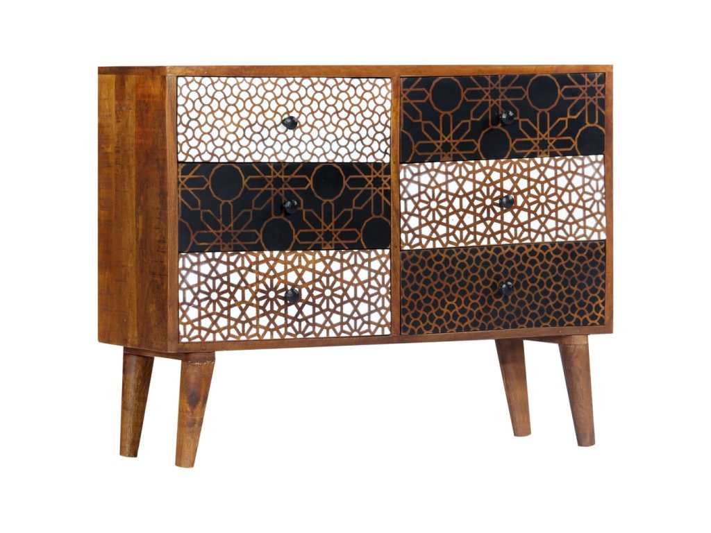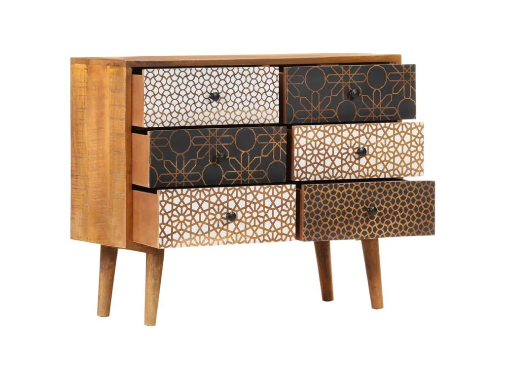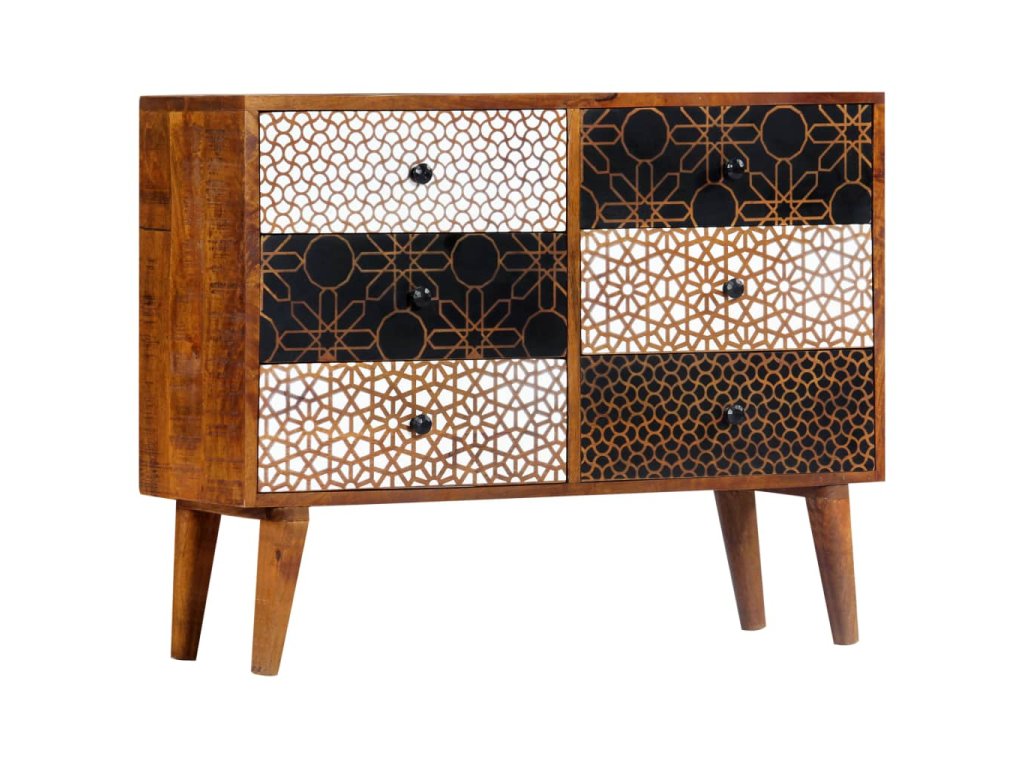 Příborník je vyroben z masivního mangovníkového dřeva. Byl naleštěn, natřen a nalakován tak, aby vynikl jeho půvabný a rafinovaný vzhled. Mangovník má husté a robustní tvrdé dřevo, jehož povrch se vyznačuje překrásnými hnědými či zlatavými pruhy a liniemi. Zásuvky zdobí líbivý potisk, což dále umocňuje příjemný vzhled příborníku. Jeho sestavení je snadné a k jeho čištění vám postačí navlhčený hadřík. Povzneste své bydlení na novou úroveň s naší elegantní skříňkou se zásuvkami!