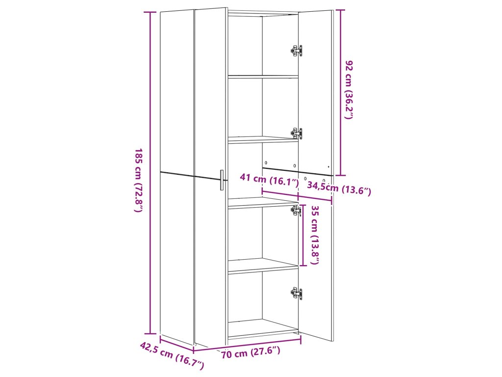 - Prostorné úložiště Díky svým rozměrům 70 x 42,5 x 185 cm nabízí hodně místa na uložení věcí. Množství přihrádek umožňuje flexibilitu při organizaci, takže si můžete uspořádat cokoli od kuchyňských potřeb po kancelářské pomůcky.