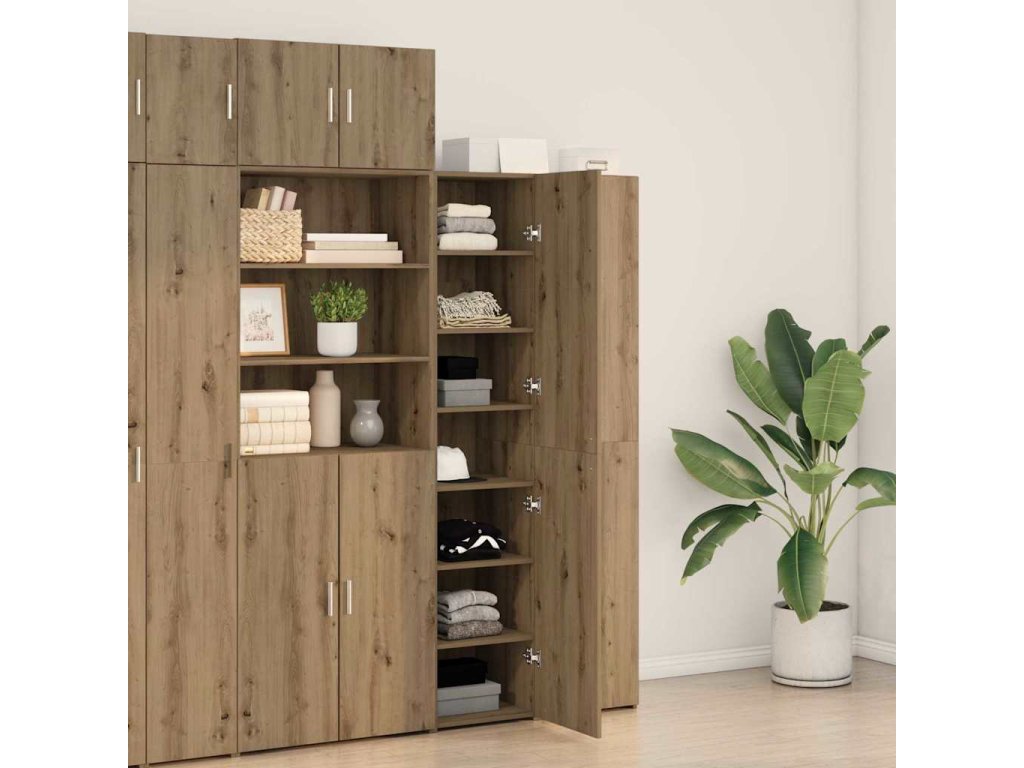 - Promyšlený úložný design Vysoký skříň má víc oddílů, které dávají dostatek místa pro všechno možné, od nádobí po knihy. Prostorné police a skryté oddíly umožňují efektivní organizaci, takže váš prostor zůstává upravený a bez nepořádku.