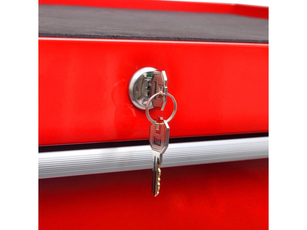 Díky integrovanému zámku je možné všechny zásuvky uzamknout najednou, což zabraňuje náhodnému otevření, je-li s vozíkem pohybováno. Dvě z otočných koleček jsou opatřena brzdami. Robustní horní deska vozíku bude ideálním místem, kde můžete odkládat nejpoužívanější nářadí tak, aby bylo po ruce. Vozík má také praktické boční madlo k snadnému přemisťování.