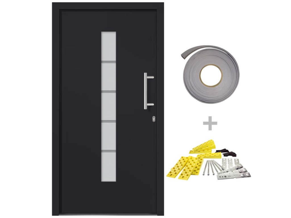 Vchodové dveře mají robustní rám i výplň, hliníkový práh, nastavitelné panty, bezpečnostní zámek s jazýčkem a háčkem a 5 stavítky, izolační zasklení a výztuhou z pozinkované oceli. Samotné dveře jsou vyrobené z hliníku a PVC a vyznačují se svou působivou bytelností a vysoce praktickým zamykáním. Obdržíte je spolu s kompletní sadou, která obsahuje nerezovou úchytku, vnitřní kliku, klíče, těsnící pásku a montážní příslušenství.