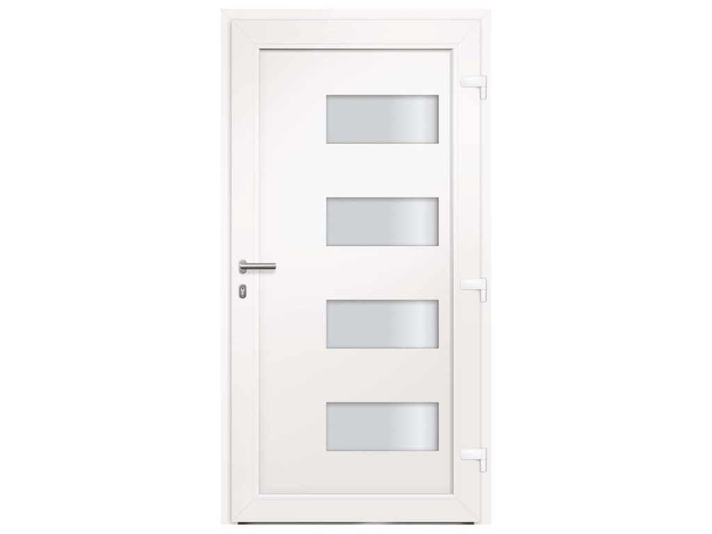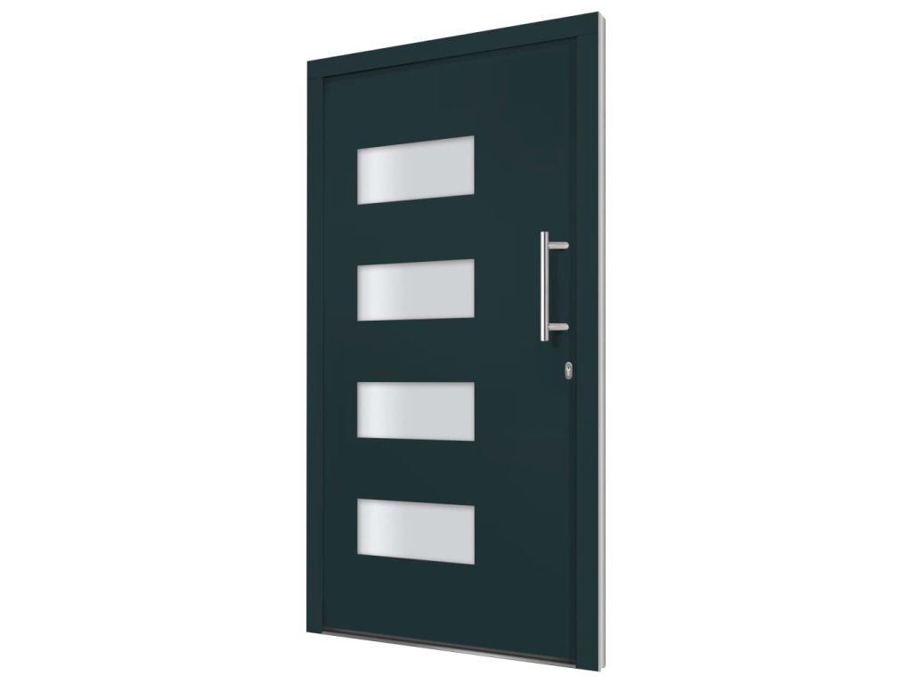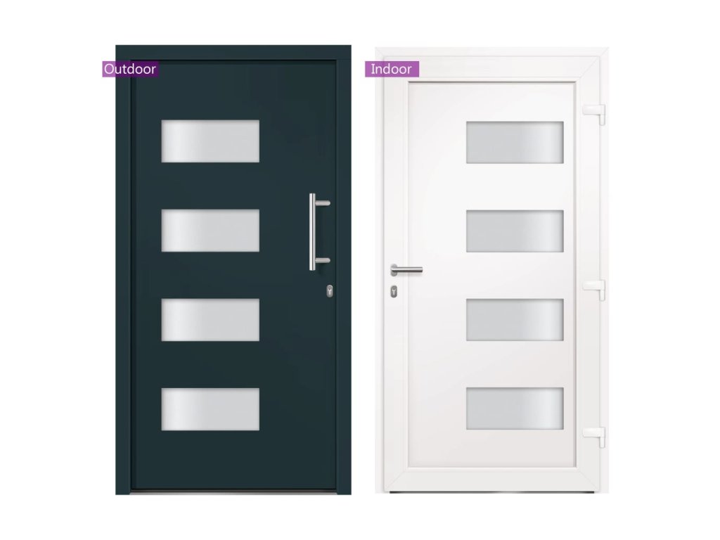 Vchodové dveře mají robustní rám i výplň, hliníkový práh, nastavitelné panty, bezpečnostní zámek s jazýčkem a háčkem a 5 stavítky, izolační zasklení a výztuhou z pozinkované oceli. Samotné dveře jsou vyrobené z hliníku a PVC a vyznačují se svou působivou bytelností a vysoce praktickým zamykáním. Obdržíte je spolu s kompletní sadou, která obsahuje nerezovou úchytku, vnitřní kliku, klíče, těsnící pásku a montážní příslušenství.