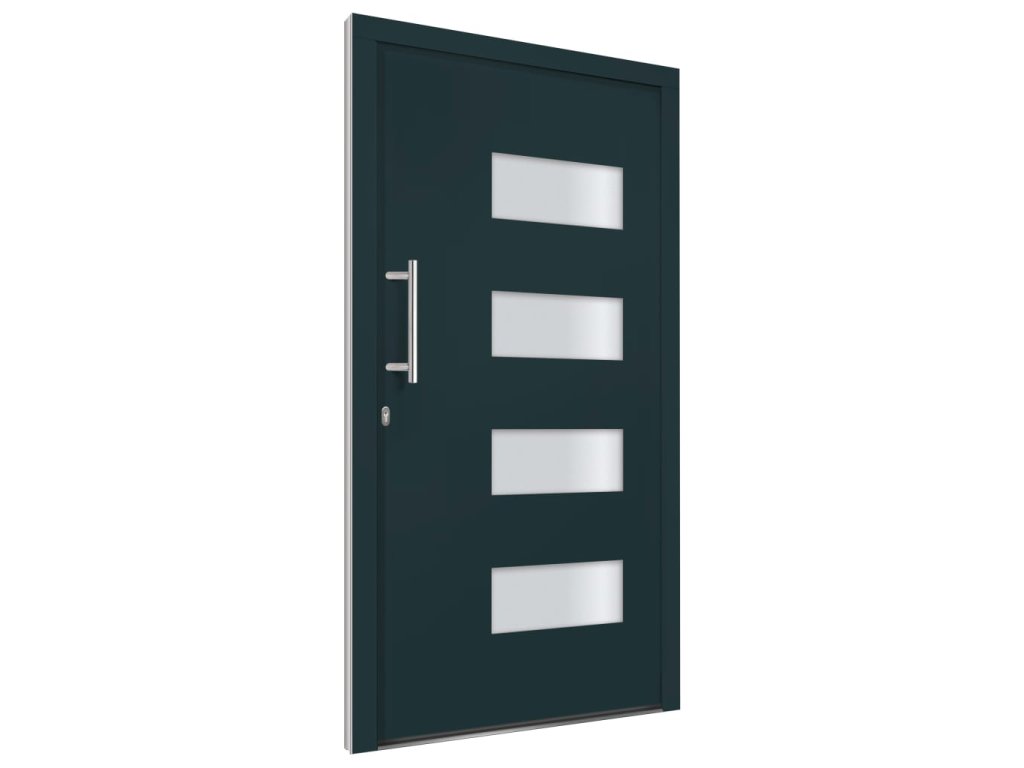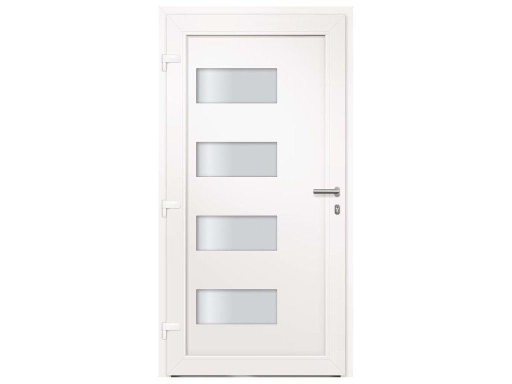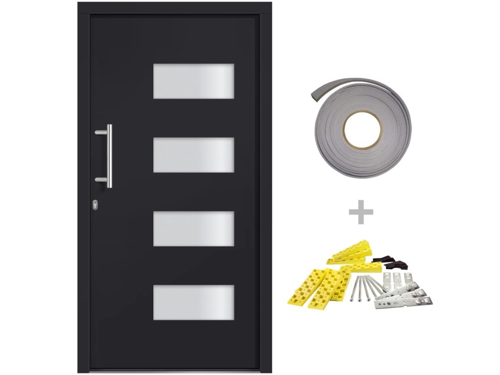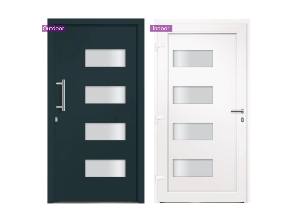 Vchodové dveře mají robustní rám i výplň, hliníkový práh, nastavitelné panty, bezpečnostní zámek s jazýčkem a háčkem a 5 stavítky, izolační zasklení a výztuhou z pozinkované oceli. Samotné dveře jsou vyrobené z hliníku a PVC a vyznačují se svou působivou bytelností a vysoce praktickým zamykáním. Obdržíte je spolu s kompletní sadou, která obsahuje nerezovou úchytku, vnitřní kliku, klíče, těsnící pásku a montážní příslušenství.