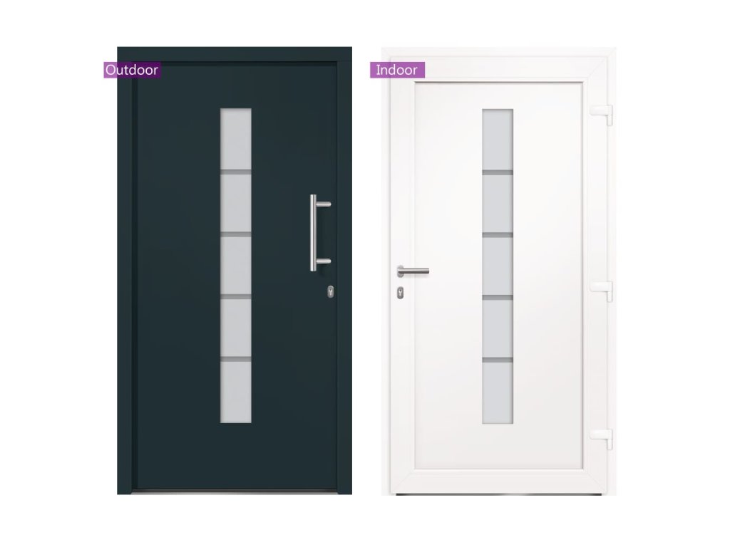 Vchodové dveře mají robustní rám i výplň, hliníkový práh, nastavitelné panty, bezpečnostní zámek s jazýčkem a háčkem a 5 stavítky, izolační zasklení a výztuhou z pozinkované oceli. Samotné dveře jsou vyrobené z hliníku a PVC a vyznačují se svou působivou bytelností a vysoce praktickým zamykáním. Obdržíte je spolu s kompletní sadou, která obsahuje nerezovou úchytku, vnitřní kliku, klíče, těsnící pásku a montážní příslušenství.