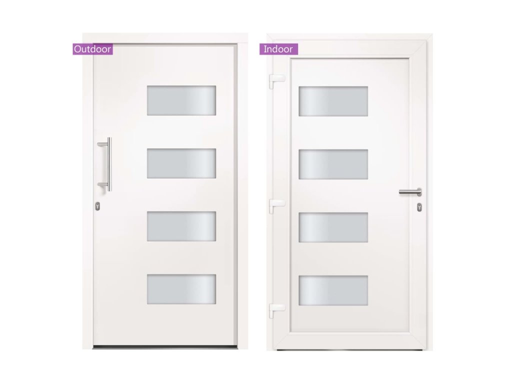 Vchodové dveře mají robustní rám i výplň, hliníkový práh, nastavitelné panty, bezpečnostní zámek s jazýčkem a háčkem a 5 stavítky, izolační zasklení a výztuhou z pozinkované oceli. Samotné dveře jsou vyrobené z hliníku a PVC a vyznačují se svou působivou bytelností a vysoce praktickým zamykáním. Obdržíte je spolu s kompletní sadou, která obsahuje nerezovou úchytku, vnitřní kliku, klíče, těsnící pásku a montážní příslušenství.