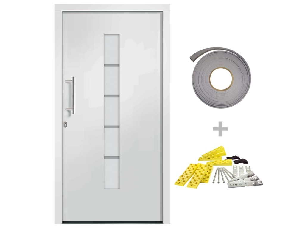 Vchodové dveře mají robustní rám i výplň, hliníkový práh, nastavitelné panty, bezpečnostní zámek s jazýčkem a háčkem a 5 stavítky, izolační zasklení a výztuhou z pozinkované oceli. Samotné dveře jsou vyrobené z hliníku a PVC a vyznačují se svou působivou bytelností a vysoce praktickým zamykáním. Obdržíte je spolu s kompletní sadou, která obsahuje nerezovou úchytku, vnitřní kliku, klíče, těsnící pásku a montážní příslušenství.