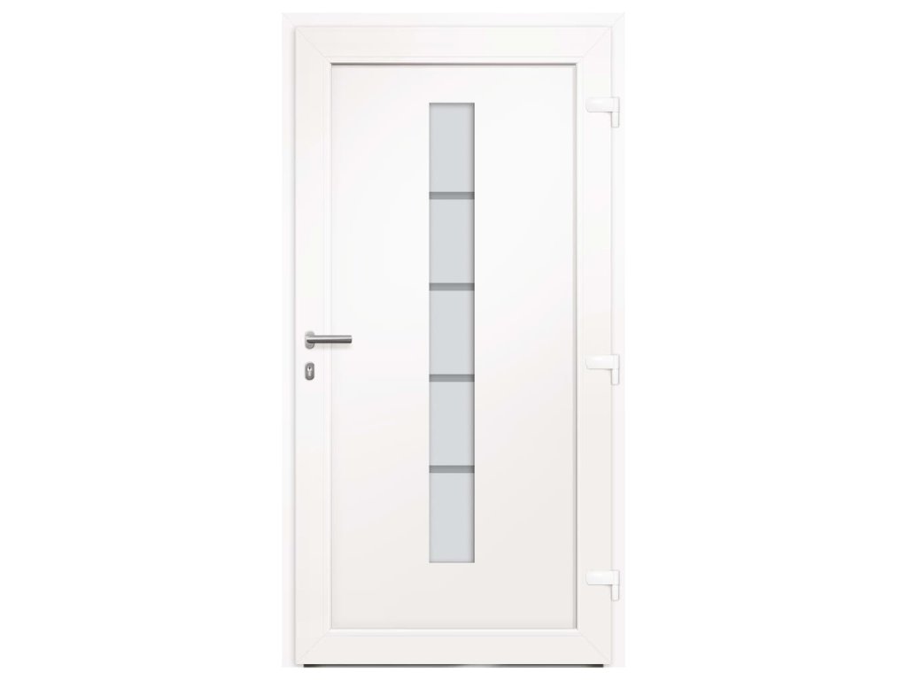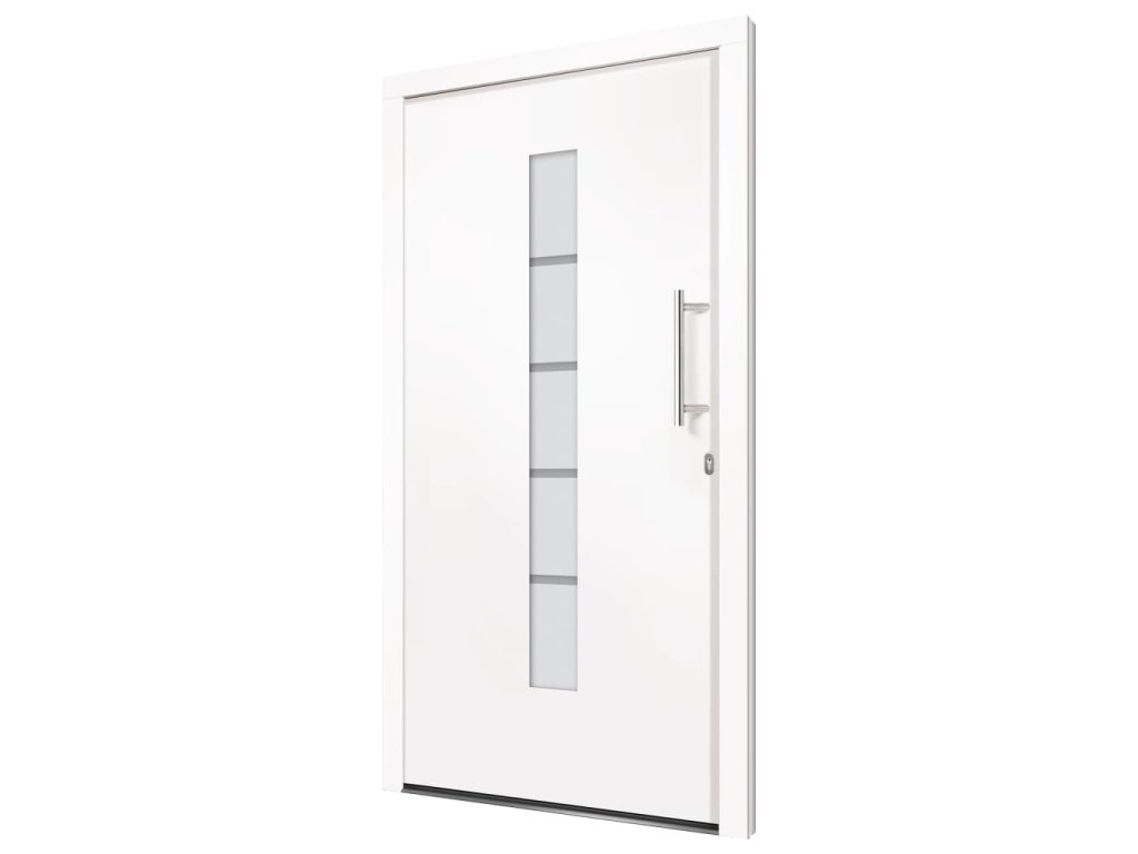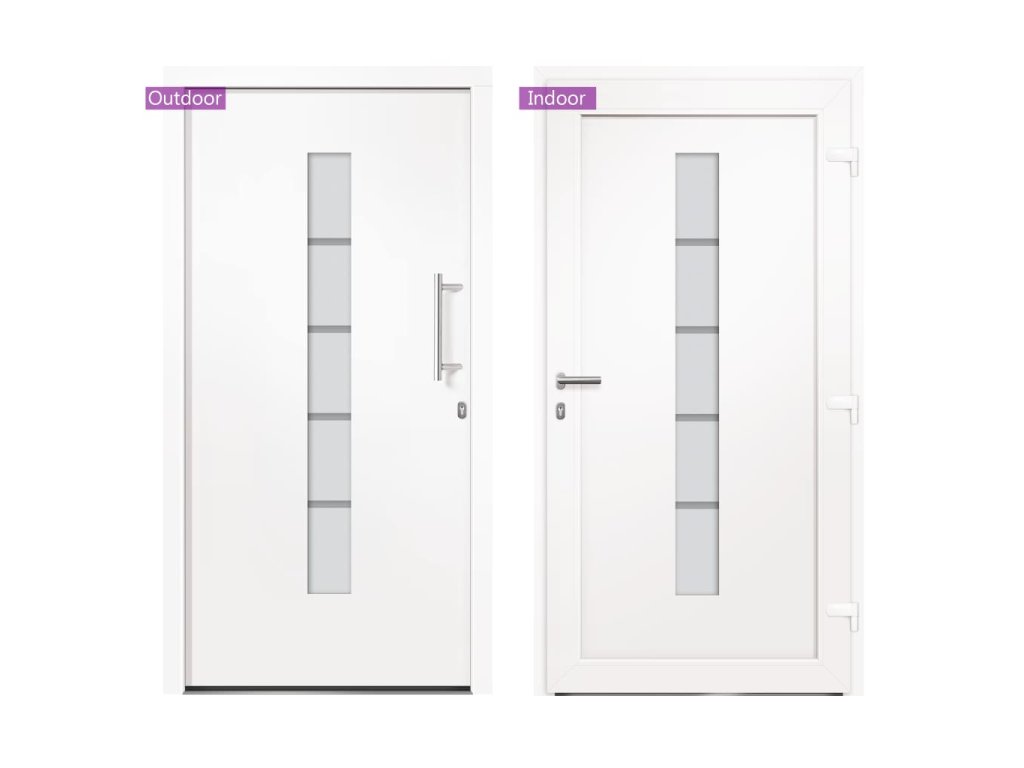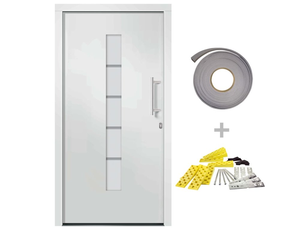 Vchodové dveře mají robustní rám i výplň, hliníkový práh, nastavitelné panty, bezpečnostní zámek s jazýčkem a háčkem a 5 stavítky, izolační zasklení a výztuhou z pozinkované oceli. Samotné dveře jsou vyrobené z hliníku a PVC a vyznačují se svou působivou bytelností a vysoce praktickým zamykáním. Obdržíte je spolu s kompletní sadou, která obsahuje nerezovou úchytku, vnitřní kliku, klíče, těsnící pásku a montážní příslušenství.