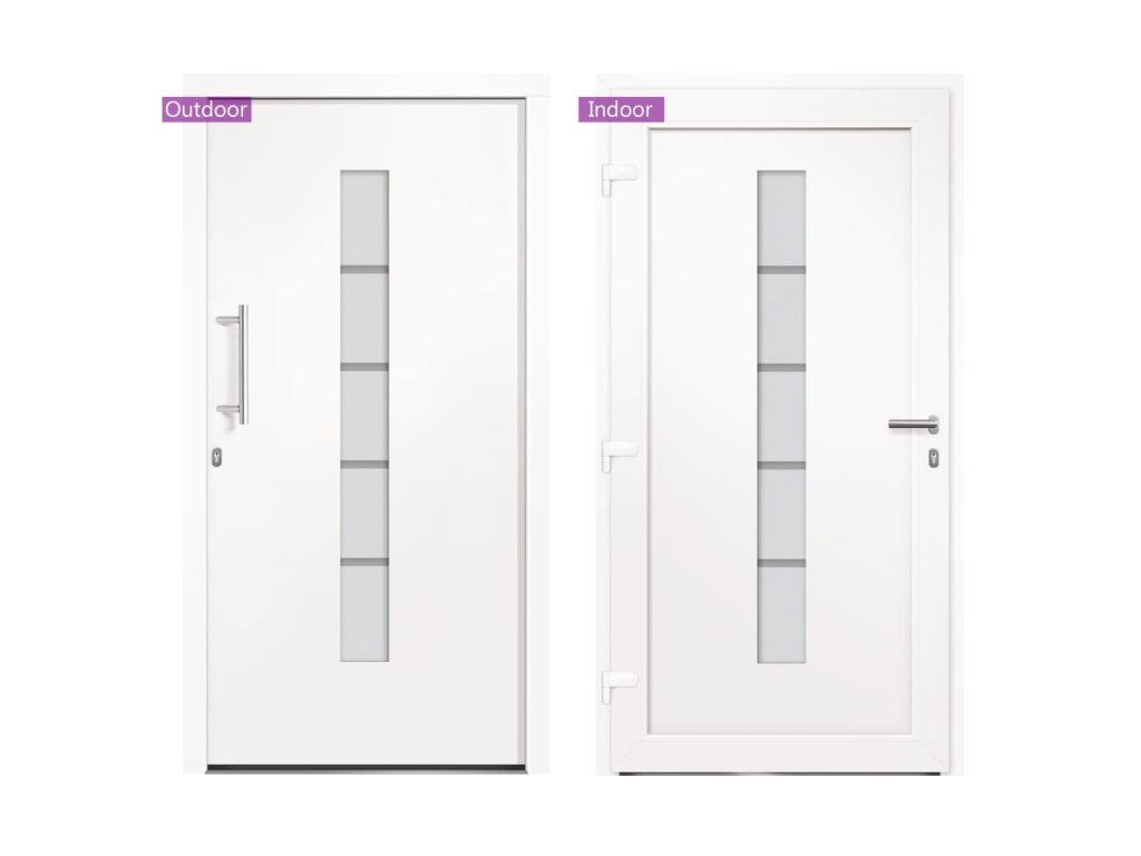 Vchodové dveře mají robustní rám i výplň, hliníkový práh, nastavitelné panty, bezpečnostní zámek s jazýčkem a háčkem a 5 stavítky, izolační zasklení a výztuhou z pozinkované oceli. Samotné dveře jsou vyrobené z hliníku a PVC a vyznačují se svou působivou bytelností a vysoce praktickým zamykáním. Obdržíte je spolu s kompletní sadou, která obsahuje nerezovou úchytku, vnitřní kliku, klíče, těsnící pásku a montážní příslušenství.