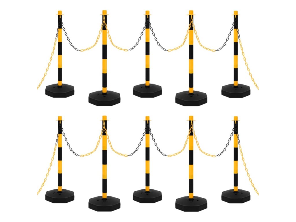 Plastový řetěz o délce 10 m lze snadno připevnit k sloupkům, a vytvořit tak vymezenou oblast. Sada je lehká a snadno přenosná. Pro větší stabilitu můžete základny sloupků naplnit vodou nebo pískem. Sada dopravních sloupků má jasné barvy, je tedy dobře viditelná i při slabém osvětlení.