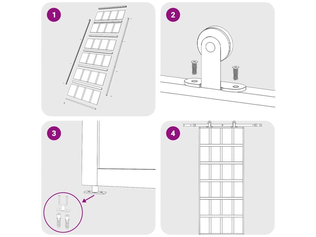 Dveře je možné nasadit pouze v kombinaci se setem kování pro posuvné dveře. Vhodné sety kování pro posuvné dveře najdete v našem obchodě (SKU: 145262–145263). Způsob montáže si můžete prohlédnout v našem instalačním manuálu pro dveře a set kování pro posuvné dveře.
