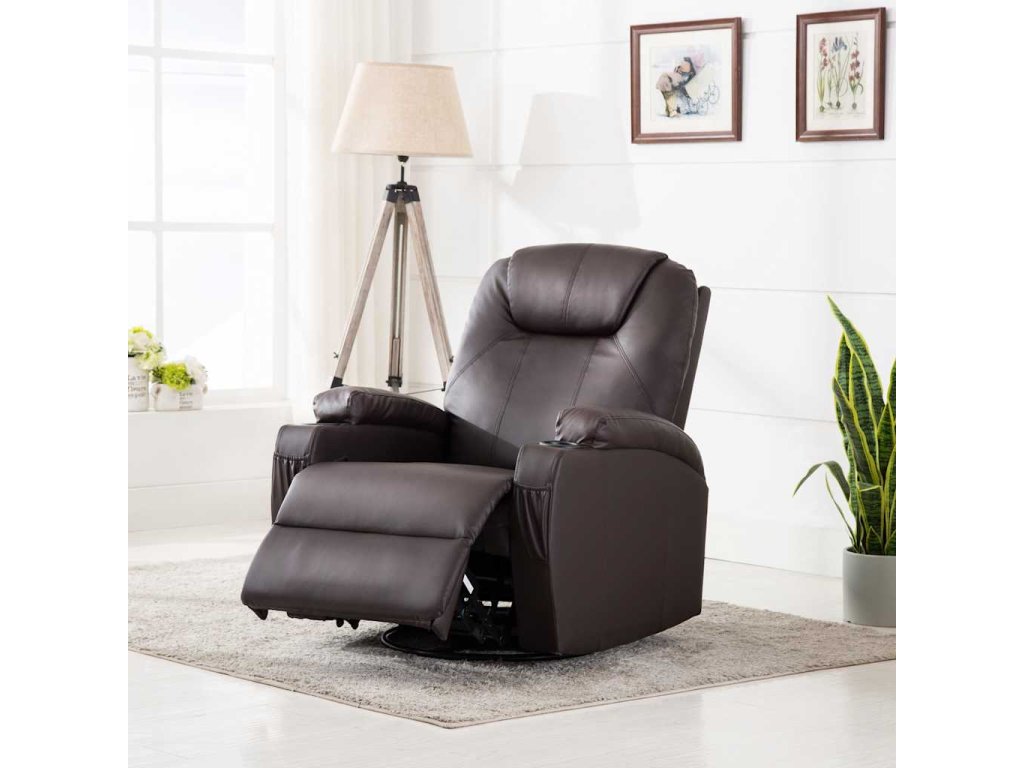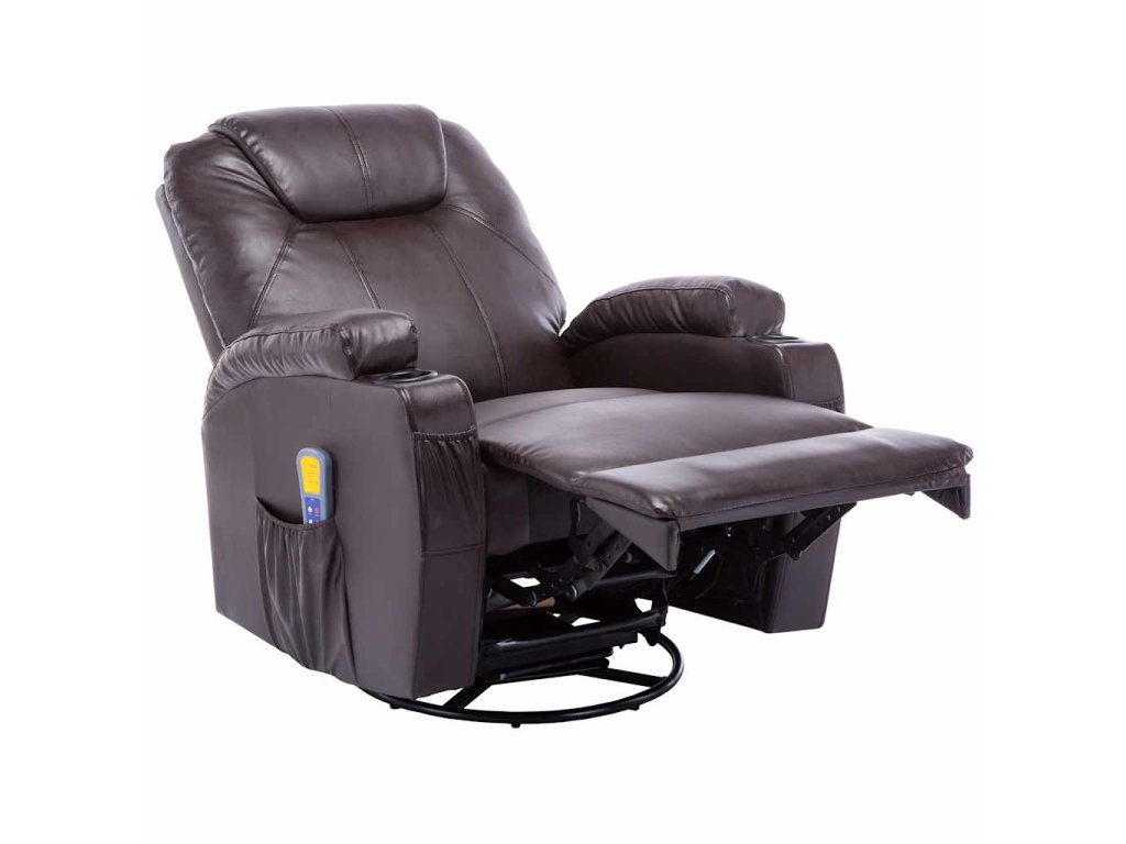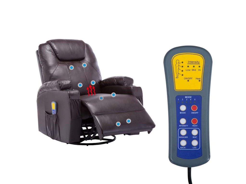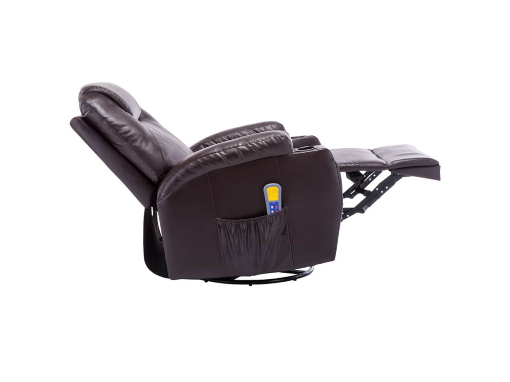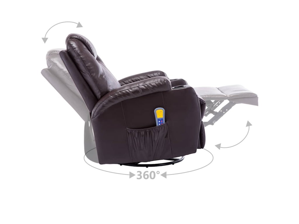 Čalouněné prémiovou umělou kůží spolu se silně polstrovaným sedadlem a opěradlem, toto otočné polohovací křeslo je navrženo tak, aby vám poskytlo maximální pohodlí. TV křeslo má otočný systém, takže máte 360° přehled o místnosti. Houpací masážní křeslo má 8 masážních uzlů, které uklidňují celé tělo. Díky funkci vytápění vydává polohovací křeslo příjemné teplo, což pomáhá zmírnit napětí. Opěradlo a opěrku nohou si můžete nastavit do různých úhlů podle vašich potřeb. Přiložené dálkové ovládání lze uložit do boční kapsy masážního křesla.