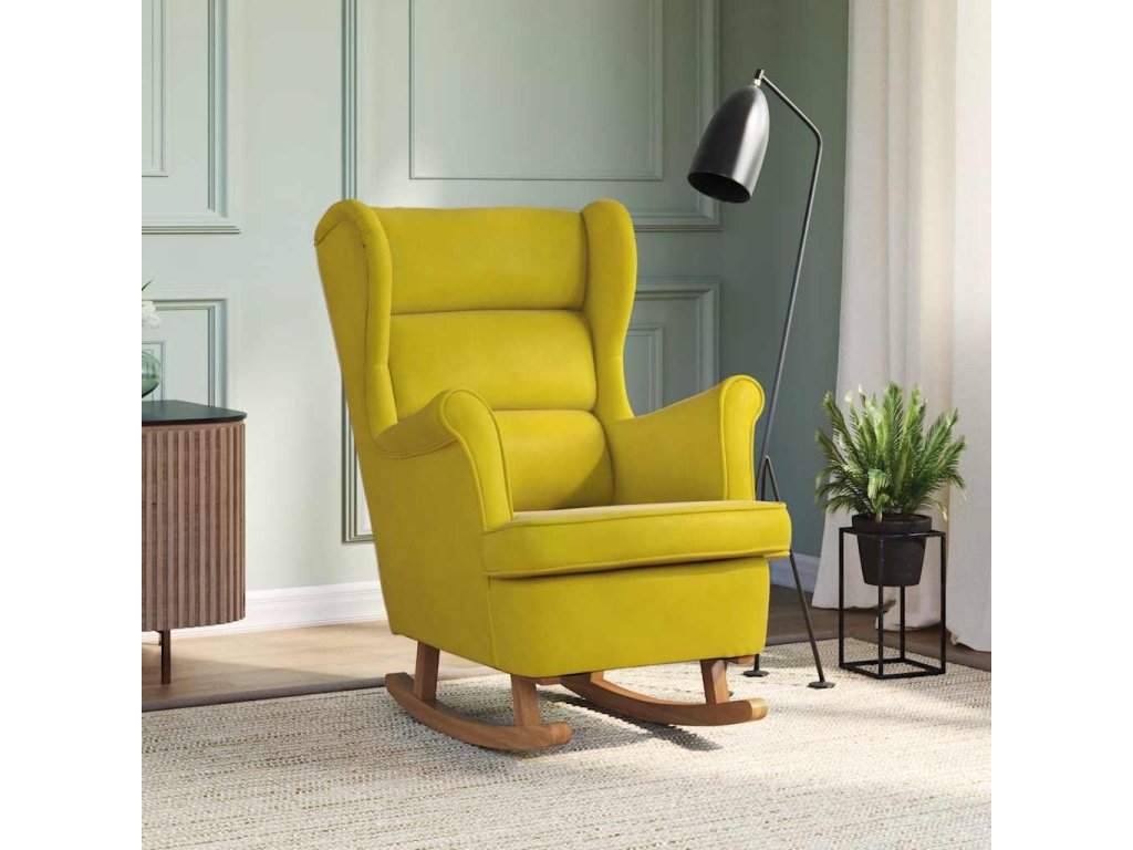 Houpací křeslo s opěradlem, žlutý samet a masivní dřevo 329370