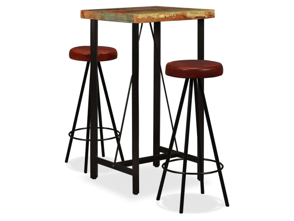 Barový set 3 kusy masivní recyklované dřevo a pravá kůže 275139