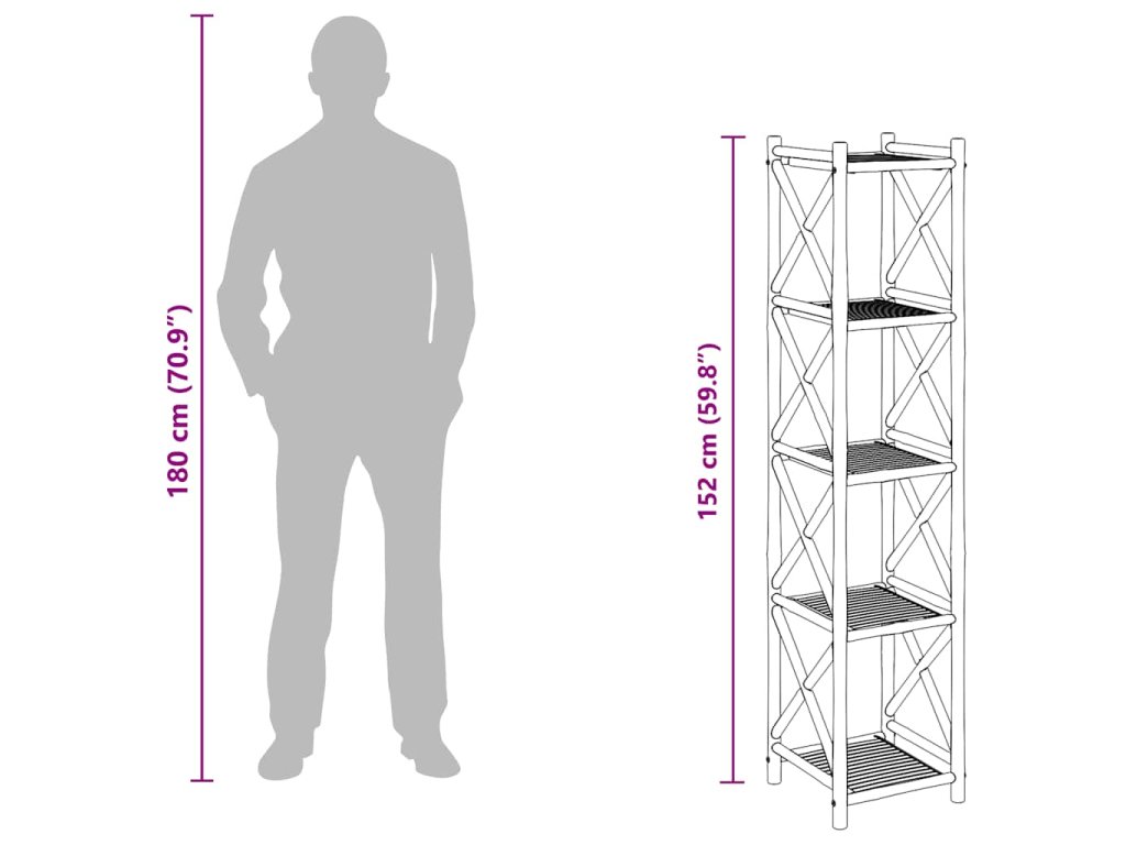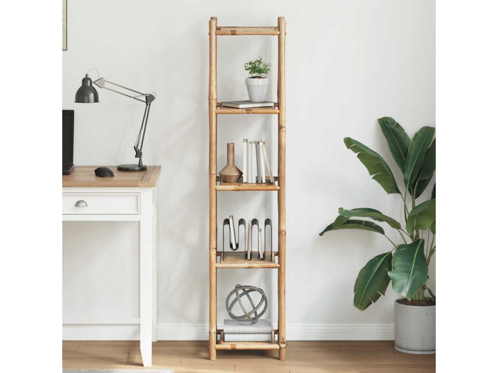 Tento bambusový regál s 5 poličkami může být používán v koupelně jako police na ručníky, v obývacím pokoji jako knihovna, nebo na verandě k vystavování hrnkových rostlin. Díky svému kompaktnímu a jednoduchému designu je ideální do malých prostor. Přirozená barva bambusu vnese do vašeho zařízení tropické kouzlo.