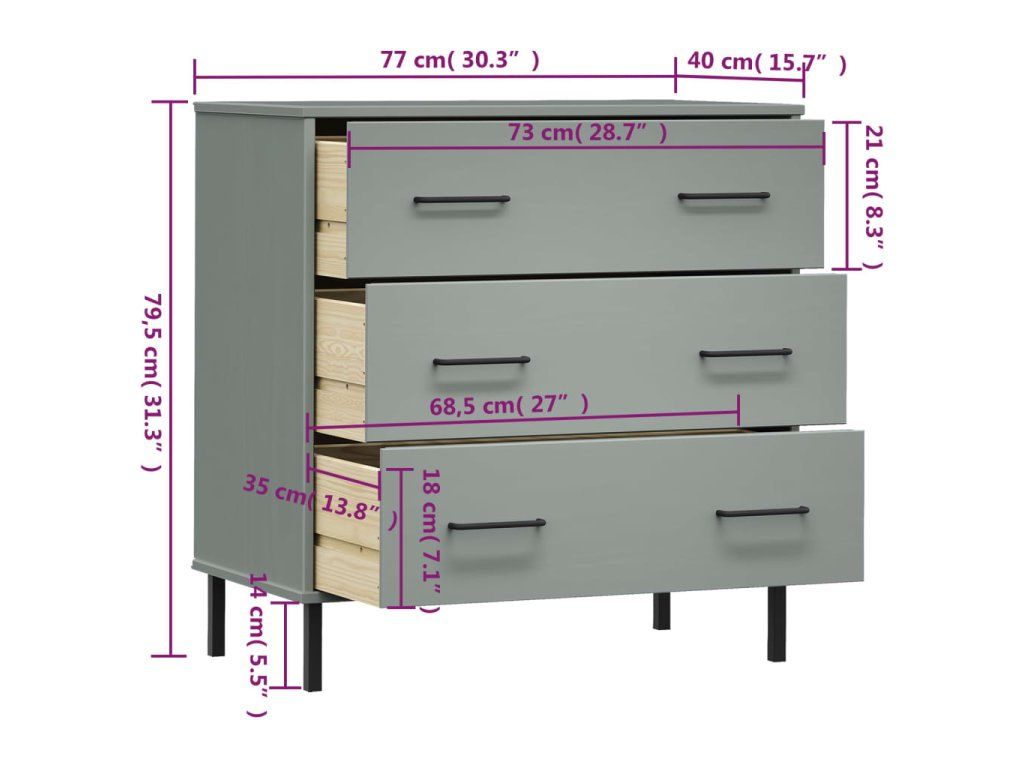 Příborník se 3 zásuvkami šedý 77x40x79,5 cm masivní dřevo OSLO 350980
