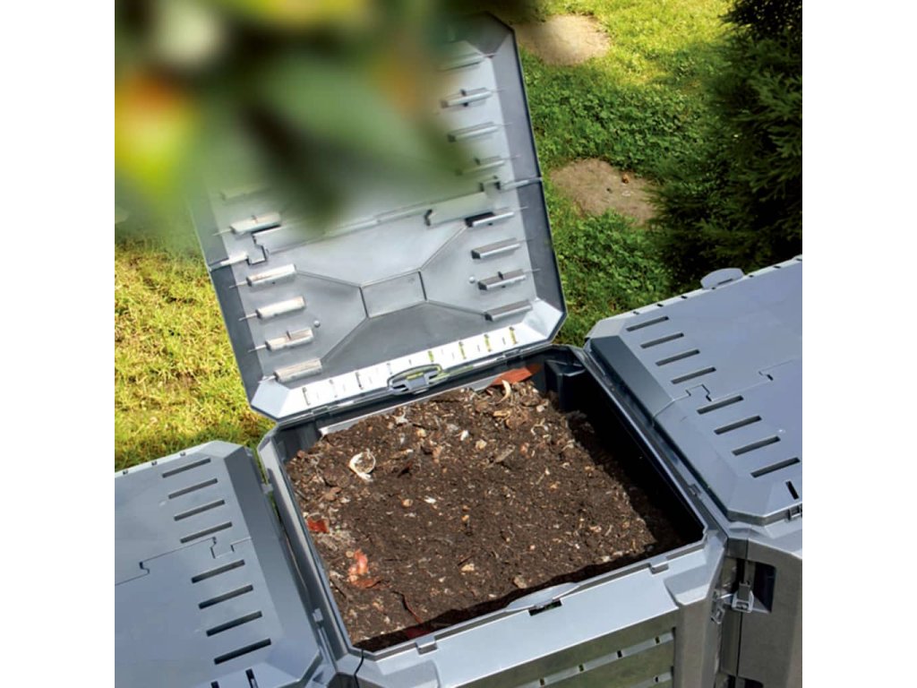 Vysoká teplota, která vzniká uvnitř kompostéru, podporuje rychlejší bakteriální rozklad a vytváří kvalitnější humus. Kontejner má kompaktní design, takže nezabírá příliš místa, ale zároveň nabízí mohutný vnitřní objem. Horní víko umožňuje snadné plnění shora, zatímco vyklápěcí dvířka ve spodní části naopak zajišťují jednoduché vytahování humusu. K sestavení kompostu nepotřebujete žádné další nástroje.