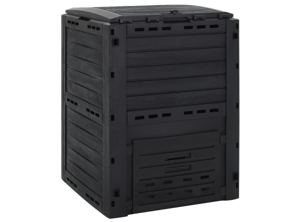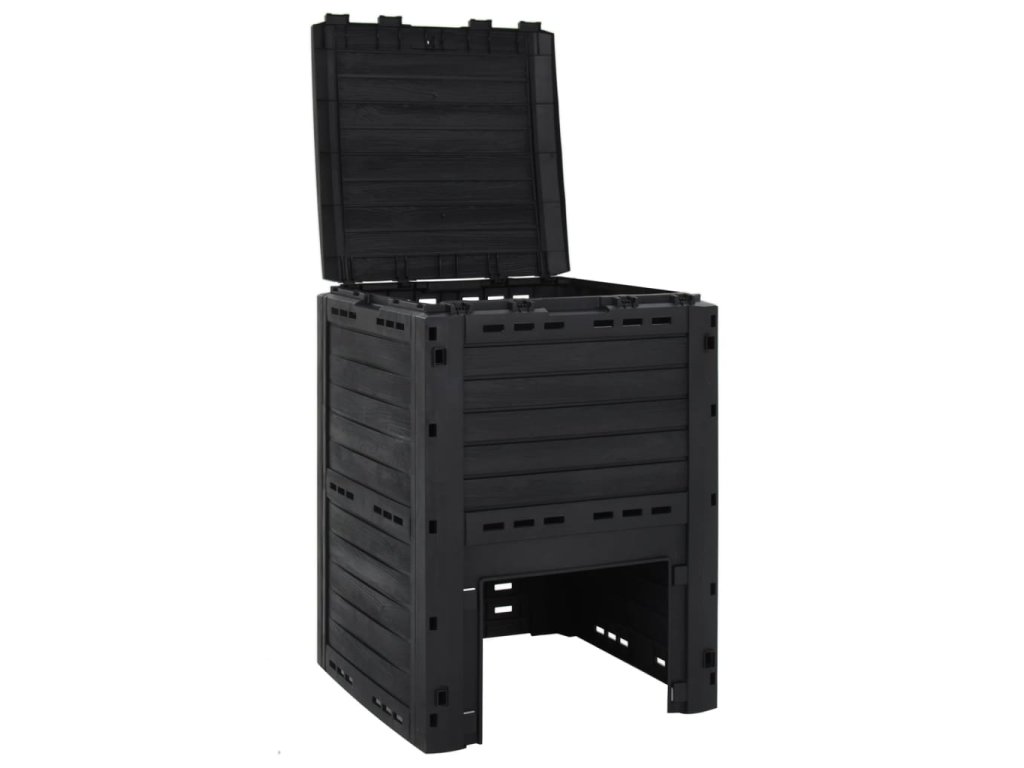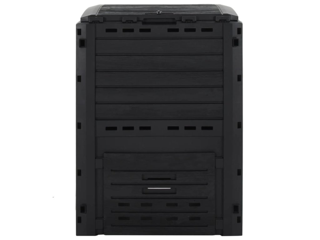 - Odolný materiál: Kompostér je vyroben z odolného polypropylenu s dřevěným vzhledem. Je odolný vůči UV záření a povětrnostním vlivům, takže je vhodný pro venkovní použití.