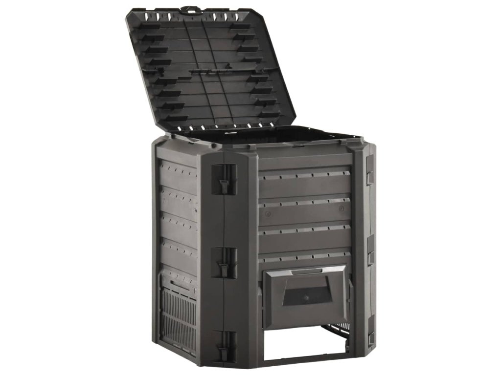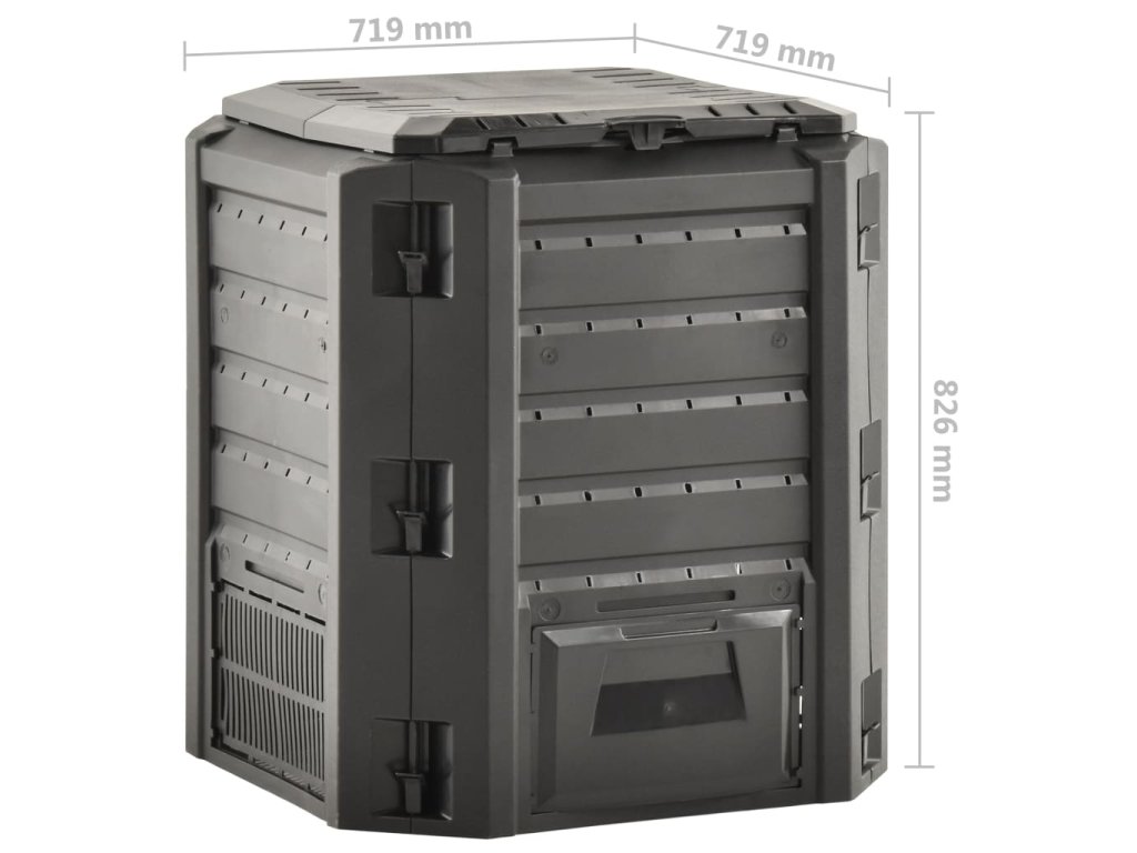 Vysoká teplota, která vzniká uvnitř kompostéru, podporuje rychlejší bakteriální rozklad a vytváří kvalitnější humus. Kontejner má kompaktní design, takže nezabírá příliš místa, ale zároveň nabízí mohutný vnitřní objem. Horní víko umožňuje snadné plnění shora, zatímco vyklápěcí dvířka ve spodní části naopak zajišťují jednoduché vytahování humusu. K sestavení kompostu nepotřebujete žádné další nástroje.