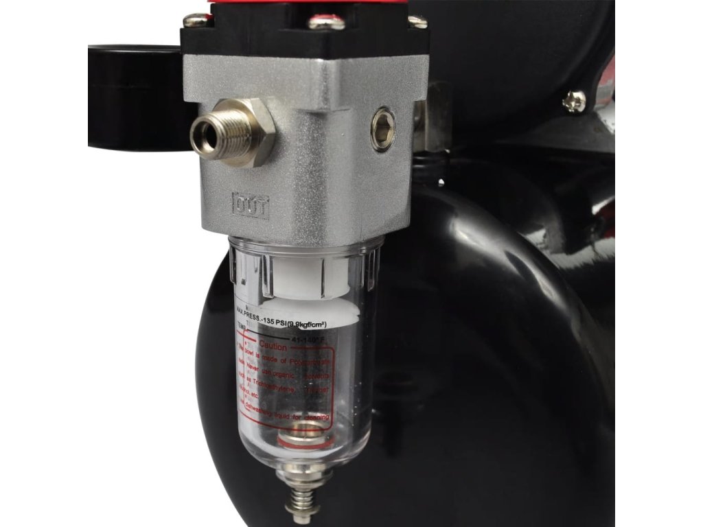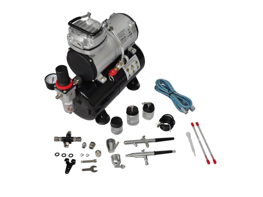 Dodávka zahrnuje 1x mini kompresor s 3litrovým vzduchovým zásobníkem, regulátor tlaku vzduchu, vzduchový filtr, manometr, originální krabička, 1x airbrush s dvojfunkční 8dílnou sadou v krabici, 1x airbrush s dvojfunkční 11dílnou sadou v krabici, 1x 3cestný hadicový konektor vč. 2 zátek, stejně jako manuál v angličtině a němčině.