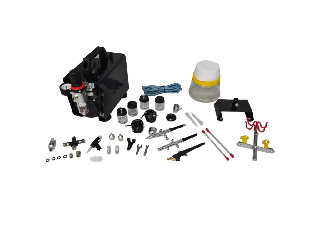 Balení obsahuje 1x mini reciproční kompresorové pouzdro, kontrolu vzduchu, vzduchový filtr, manometr, držák pistole a originální krabici, 1x airbrush se 7dílným setem s jednoduchou funkcí v úložné krabici, 1x airbrush s 8dílným setem s dvojitou funkcí v úložné krabici, 1x airbrush s 9dílnou sadou s dvojitou funkcí v úložné krabici, 1x 3 v 1 čistící nádoba k airbrush setu, 1x držák na airbrush, 1x mini filtr, 1x 3cestný konektor k hadici včetně 2 zátek a také manuál v angličtině a němčině.