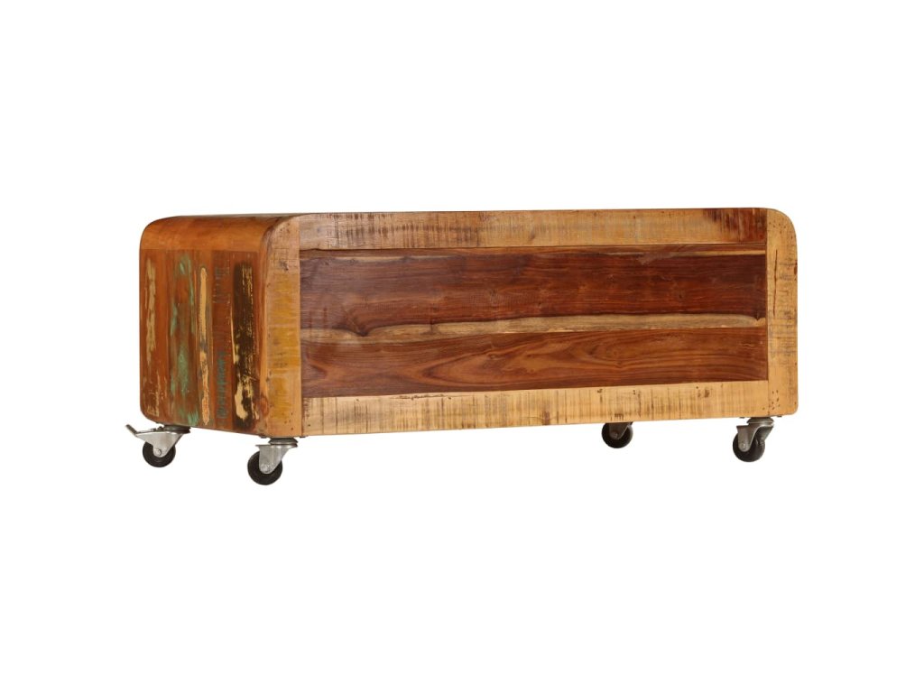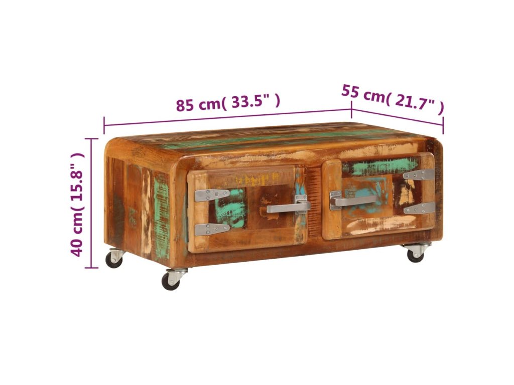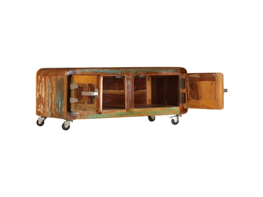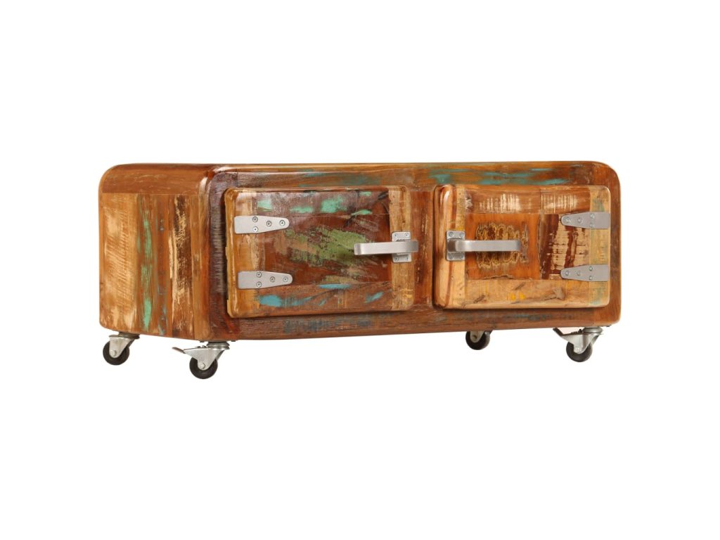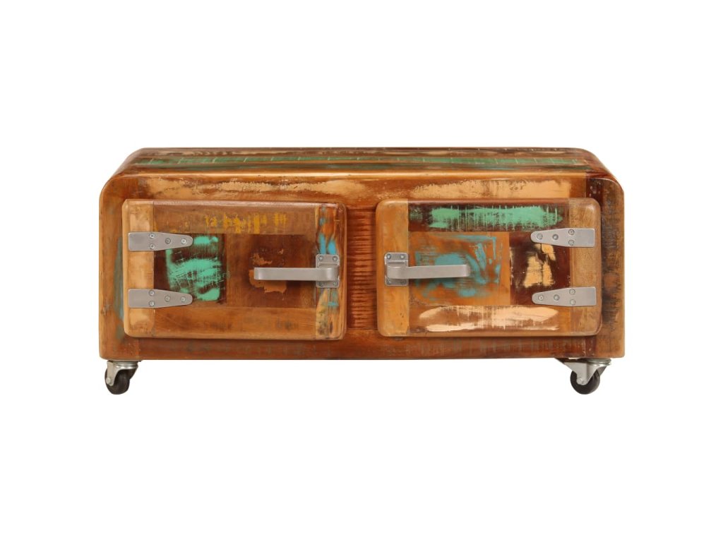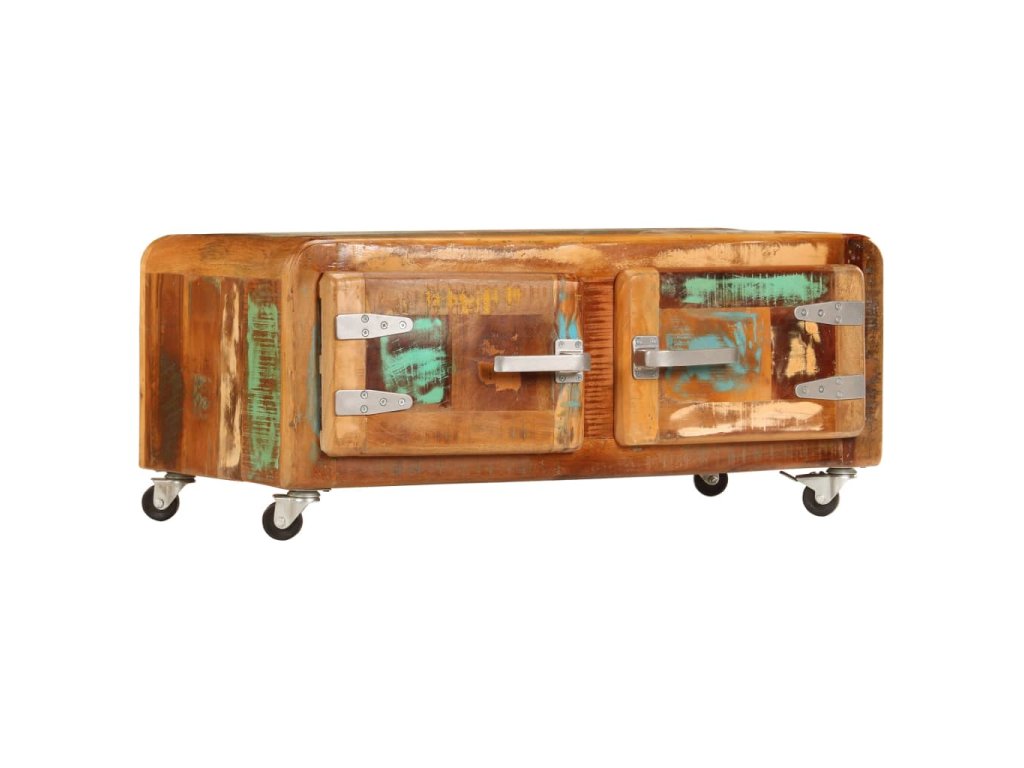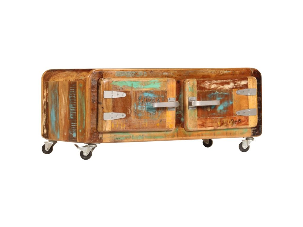 Stolek k pohovce je vyrobený z masivního recyklovaného dřeva, které pochází z trámů, podlah a podpěrných nosníků ze starých budov určených k demolici. Sestává tedy z různých druhů dřeva, jako jsou borovice, teak, buk, dub, cedr, mangovník, akácie apod. Recyklované dřevo tak nabývá vlastností všech těchto rozličných typů dřevin. Navíc je již zestárlé, ošlehané a vyschlé, takže se nesmršťuje ani neohýbá. Odkládací stolek je celý ručně vyrobený a elegantní kresba dřeva ho činí naprosto jedinečným a lehce odlišným od ostatních. Kovové prvky dodávají stolku industriální nádech. Stolek disponuje 2 skříňkami s dvířky, jež vám poskytnou spoustu prostoru k uložení vašich multimediálních zařízení, knížek a dalších věcí. Je rovněž vybavený 4 kolečky, takže se snadno přesouvá.
