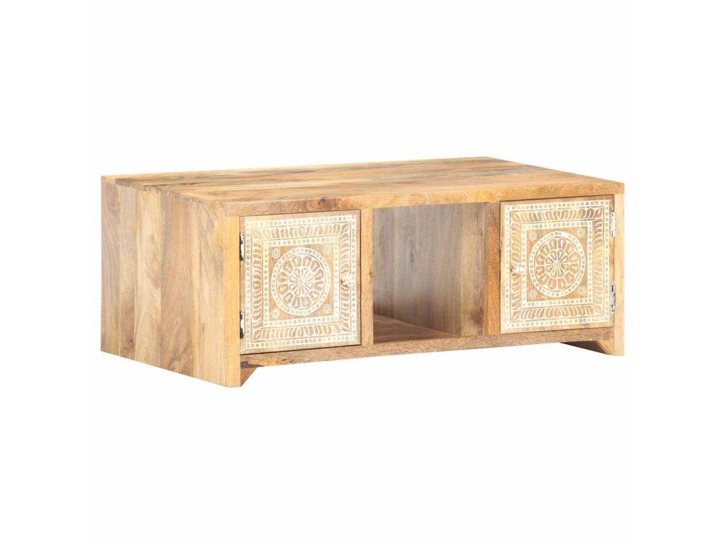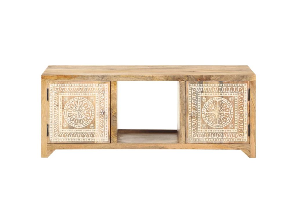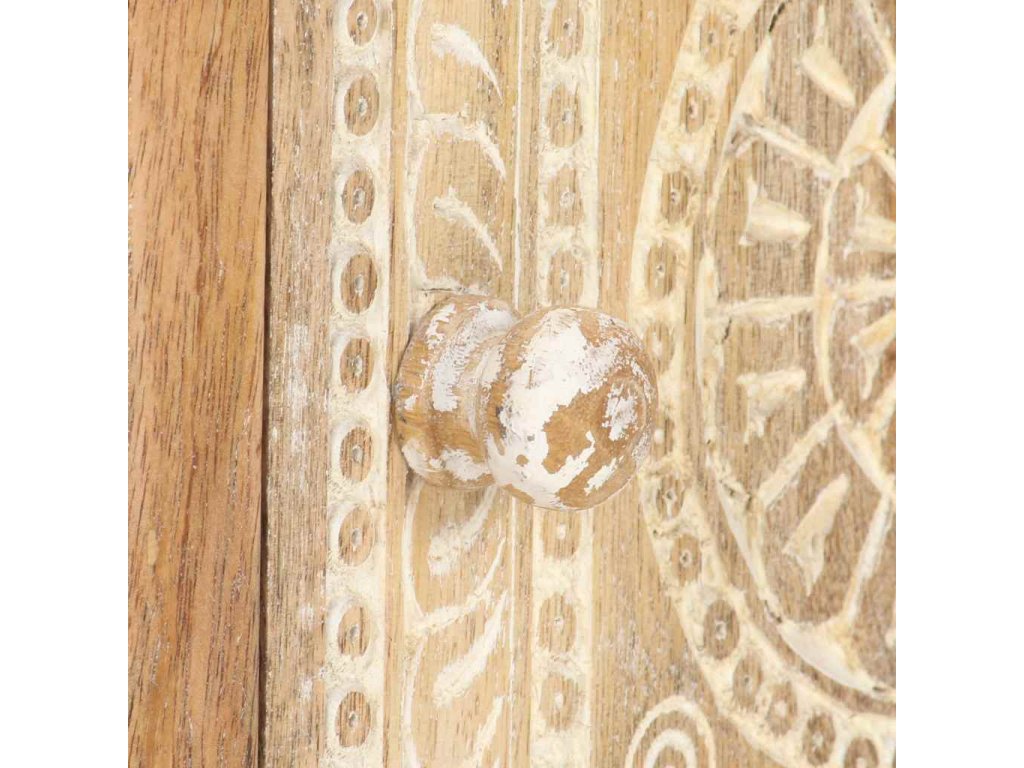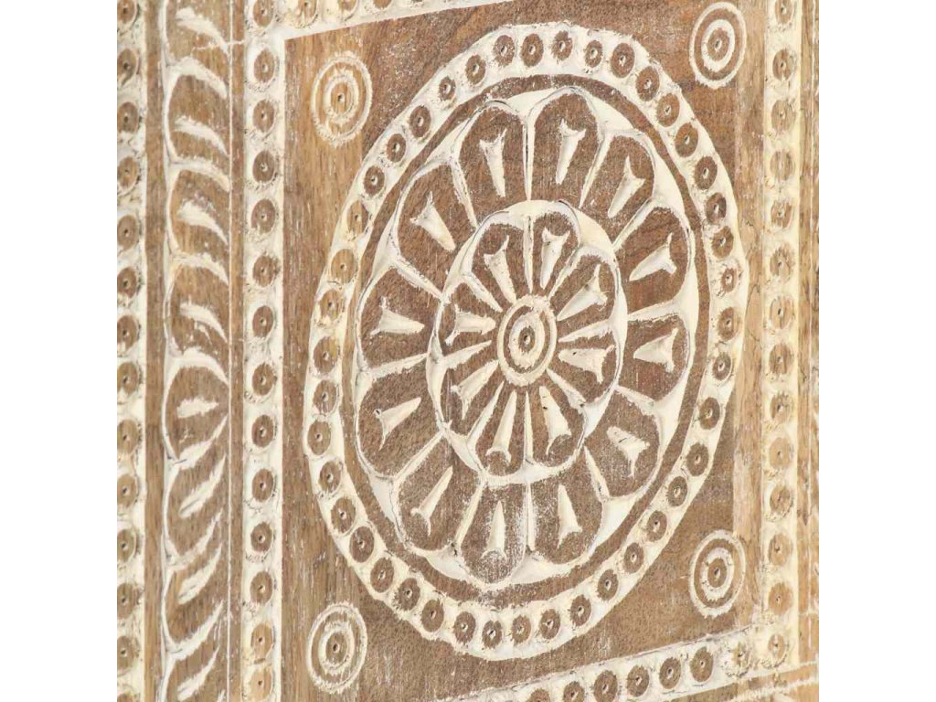 Masivní mangovník je tropické tvrdé dřevo. Toto dřevo jednak unese značnou váhu a jednak výborně odolává působení času a neopotřebovává se. Precizní řemeslné zpracování a nádherná kresba dřeva navíc každé odkládací skříňce propůjčuje unikátní charakter, takže nenajdete dvě stejné. Odkládací stolek je vybavený 1 poličkou a 2 přihrádkami, ve kterých najdete spoustu úložného prostoru, kde si můžete vystavit nebo uložit vše potřebné. Co víc, bělený vyřezávaný vzor zdůrazňuje krásu dřeva.