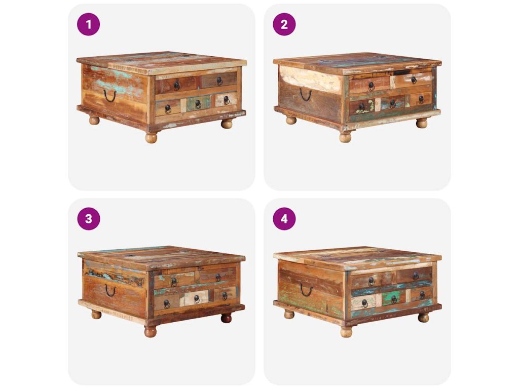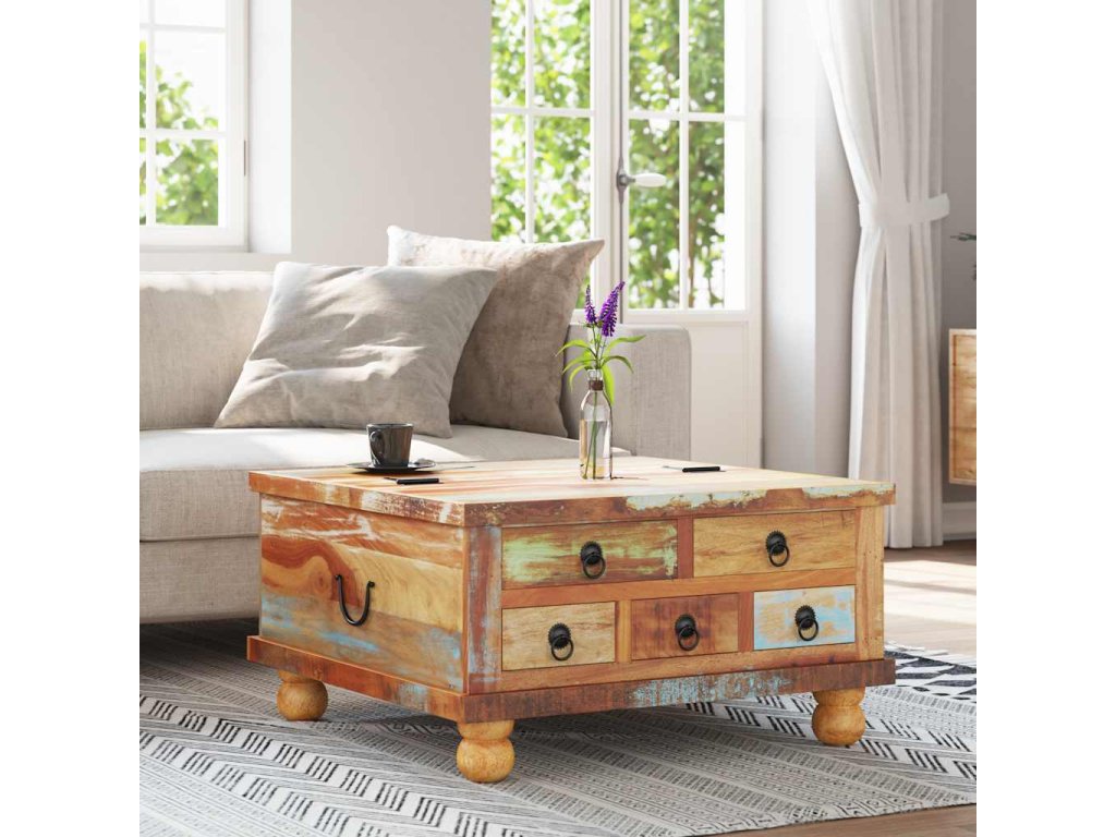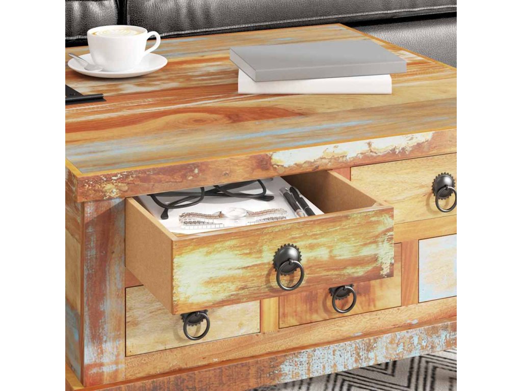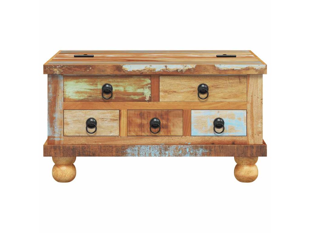 Retro konferenční stolek je ručně vyroben z recyklovaného dřeva, je pevný, odolný a krásný a má vlastnosti různých dřevin, jako je teakové dřevo, mangovníkové dřevo, akácie, recyklované dřevo, tvrdé dřevo atd. Každá fáze výrobního procesu se provádí s největší péčí, ať už se jedná o leštění, natírání nebo lakování. Zručné řemeslné zpracování a krásná kresba dřeva propůjčuje každému kusu nábytku jeho jedinečný a od všech ostatních lehce odlišný vzhled. Navíc 5 zásuvek a velká vnitřní přihrádka poskytují dostatek prostoru pro všechny věci, které chcete mít na dosah ruky.