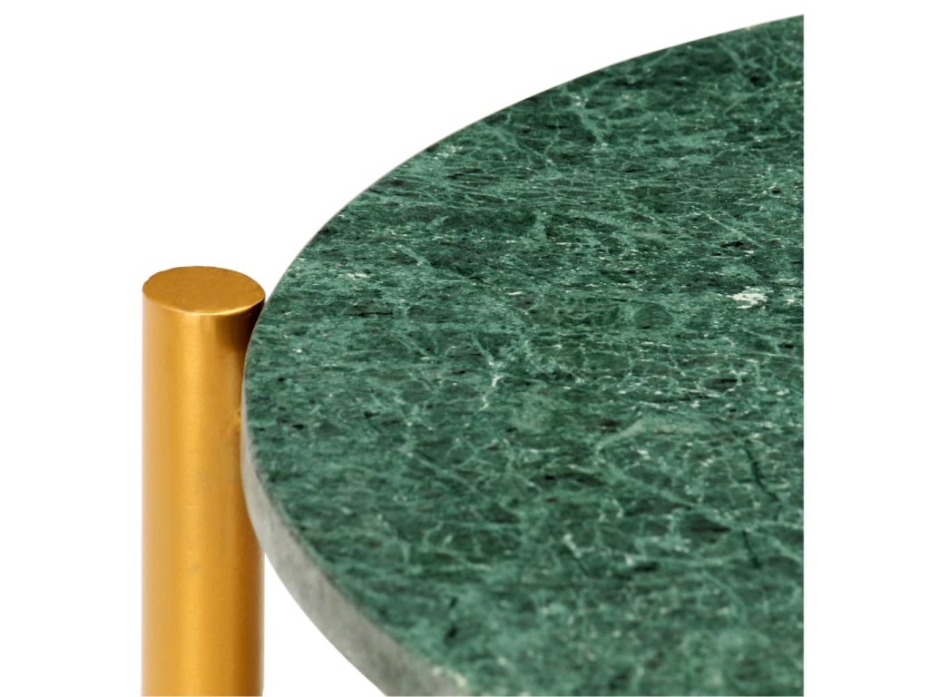 Stolek je vyrobený z pravého kamene s mramorovým vzorem a odolného práškově lakovaného železného rámu. Je stabilní a má dlouhou životnost. Na stabilní stolní desku si můžete s důvěrou umístit vaše nápoje, vázy, mísy s ovocem a jiné dekorace. Tento koncový stolek se snadno čistí vlhkým hadříkem.