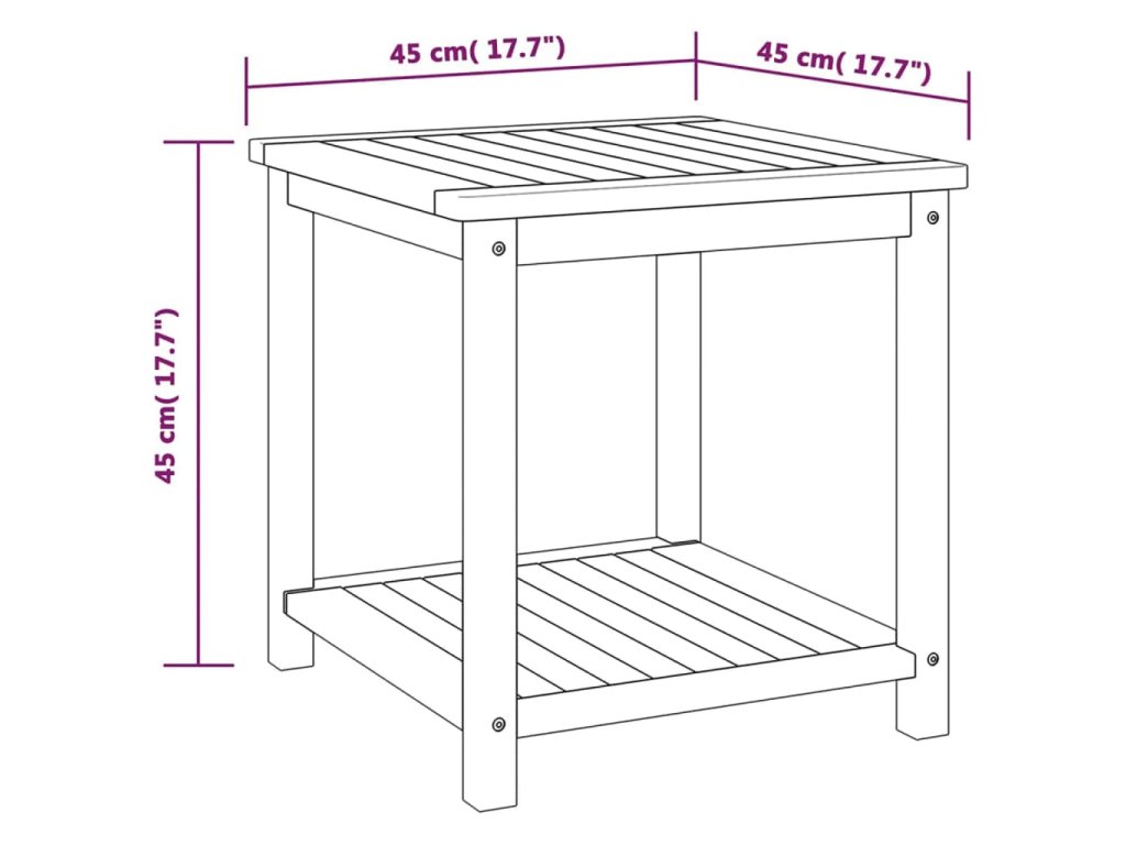 Stolek je vyroben z masivního akáciového dřeva a je odolný vůči povětrnostním vlivům a velmi bytelný. Pevná horní deska i spodní polička vám poskytnou spoustu místa pro umístění nejrůznějších předmětů. Montáž je snadná.