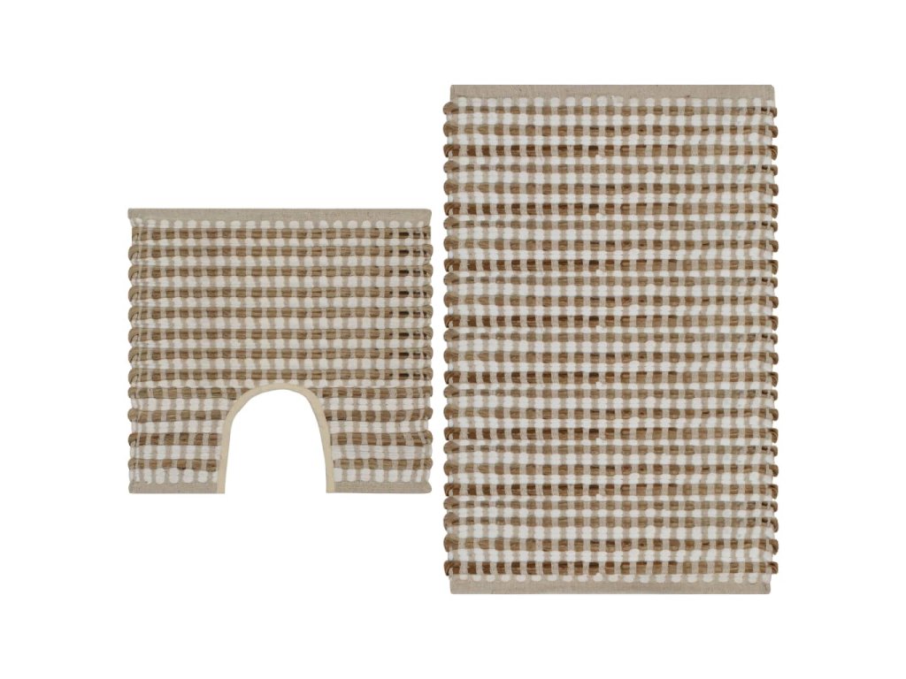 Jutová vlákna jsou přirozeně odolná a zároveň jemná a měkká na dotek a mají přírodní odstín. Vzor je ručně vpletený z odolné polyesterové tkaniny. Předložka skvěle zapadne do každé koupelny. Balení obsahuje 1 předložku do koupelny a 1 předložku na WC nebo k umyvadlu.