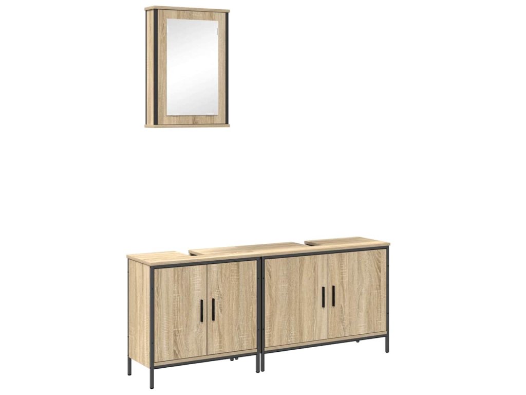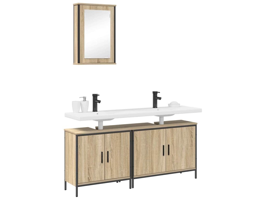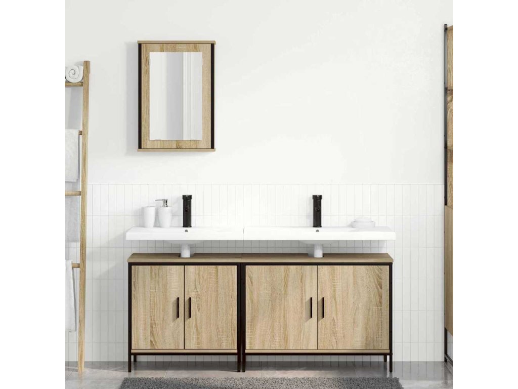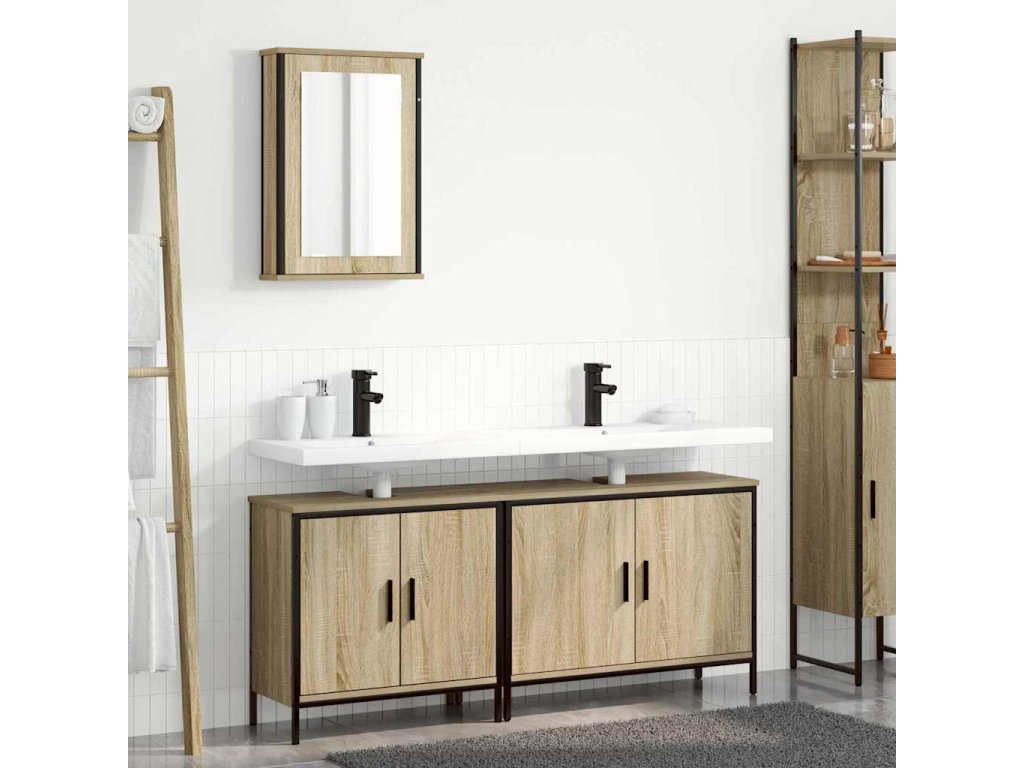 Tato moderní koupelnová souprava spojuje minimalistický styl s funkčním úložným prostorem. S elegantními panely z inženýrského dřeva a odolnými ocelovými rámy vám zaručí dlouhou životnost a zlepší uspořádání i vzhled vaší koupelny. Součástí soupravy jsou různé skříňky, které se postarají o všechny vaše potřeby, a krásně doplňují teplou hnědou barvu dveří s chladem černého rámu.