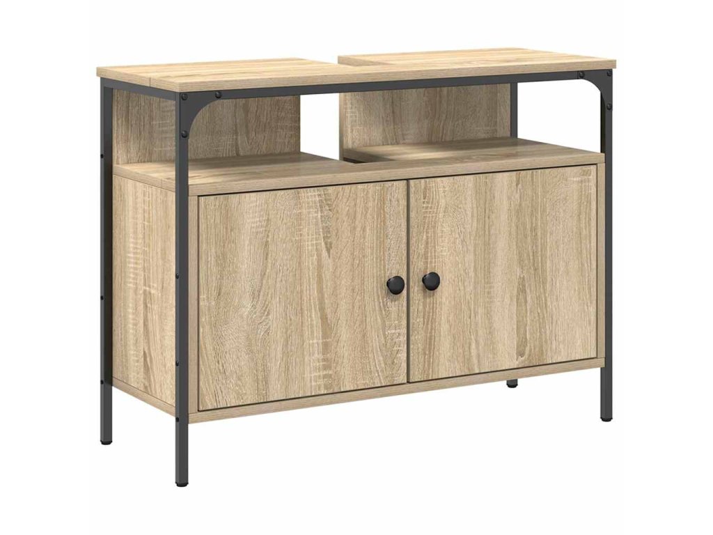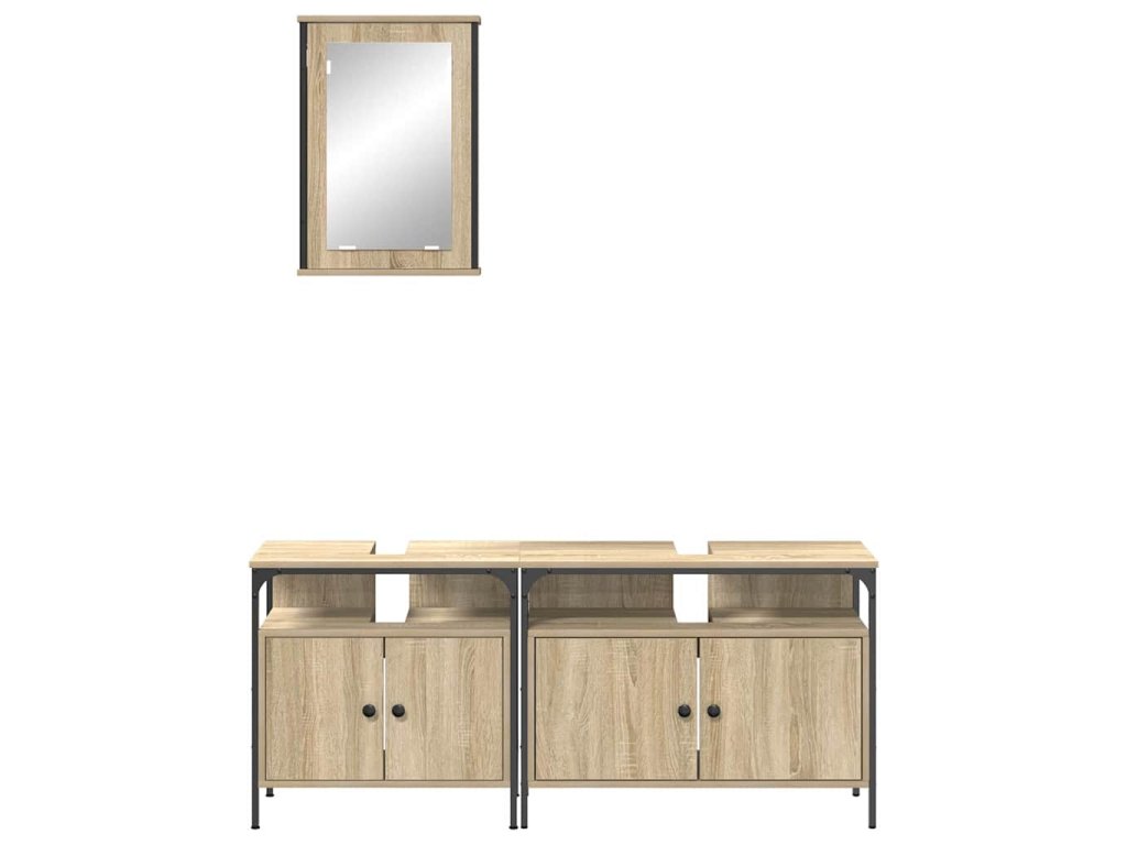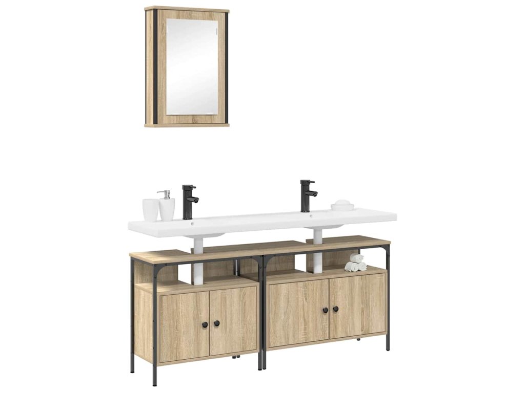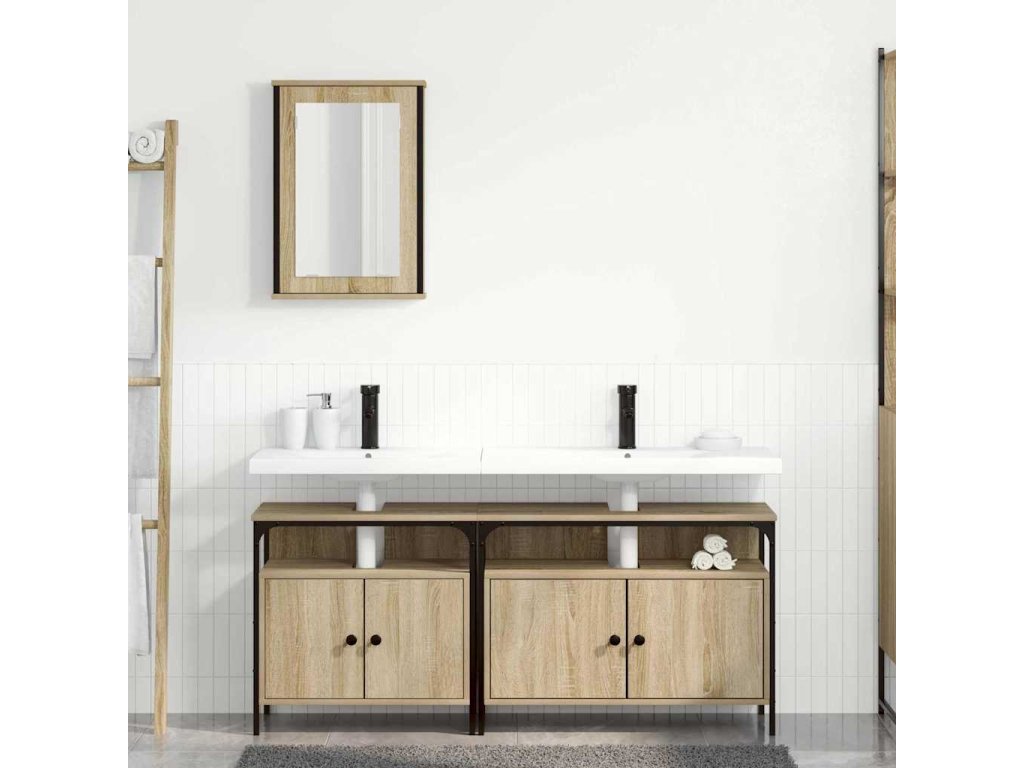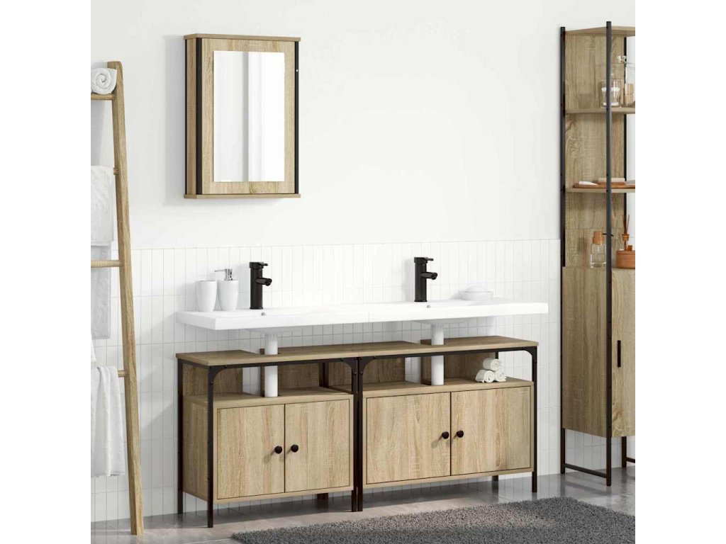 Tato moderní koupelnová sestava nábytku mění pojetí stylu a funkčnosti ve vaší koupelně. Kombinuje inženýrské dřevo a ocel, nabízí minimalistický design s čistým, moderním vzhledem. Navržená tak, aby skvěle zapadla do jakéhokoli interiéru, mění vaši koupelnu na stylové útočiště. Hnědé odstíny dodávají teplo a černý ocelový rám přidává šmrnc. Sestava má prostorné skříňky, které vám pomohou efektivně organizovat toaletní potřeby a další věci.