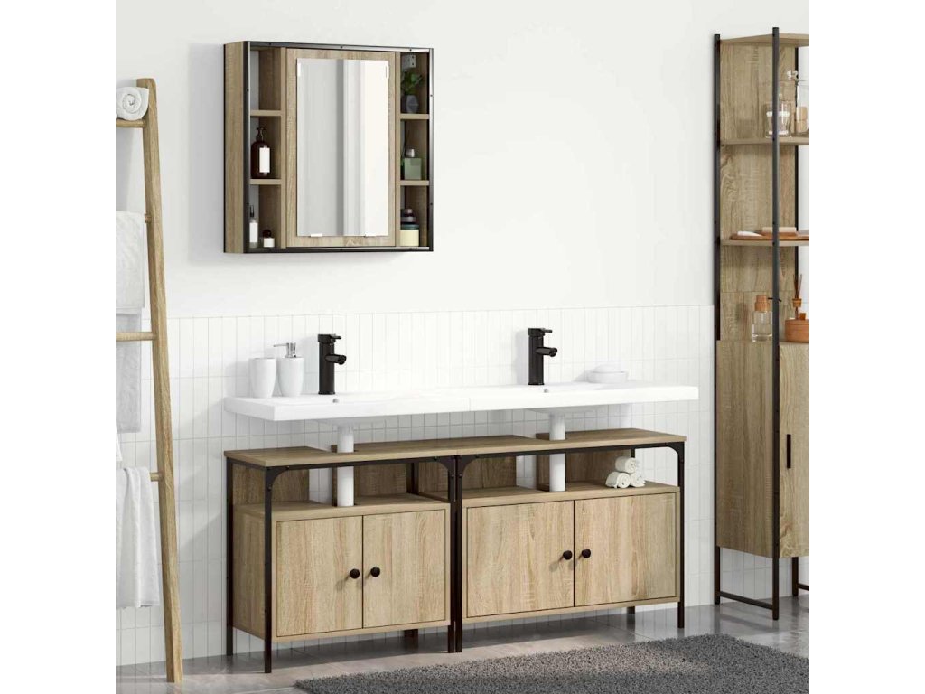 Tato moderní koupelnová sada má sofistikovaný design, který spojuje funkčnost s minimalistickým stylem, ideální pro současné prostory. Její čisté linie a elegantní vzhled obohacují vaši koupelnu a dodávají jí nádech elegance. Navržená pro interiér, sada nabízí dostatek úložného prostoru, ideální pro udržení toaletních potřeb a koupelnových nezbytností v pořádku. S odolnou konstrukcí a úsporným designem se perfektně hodí do jakékoli koupelny.