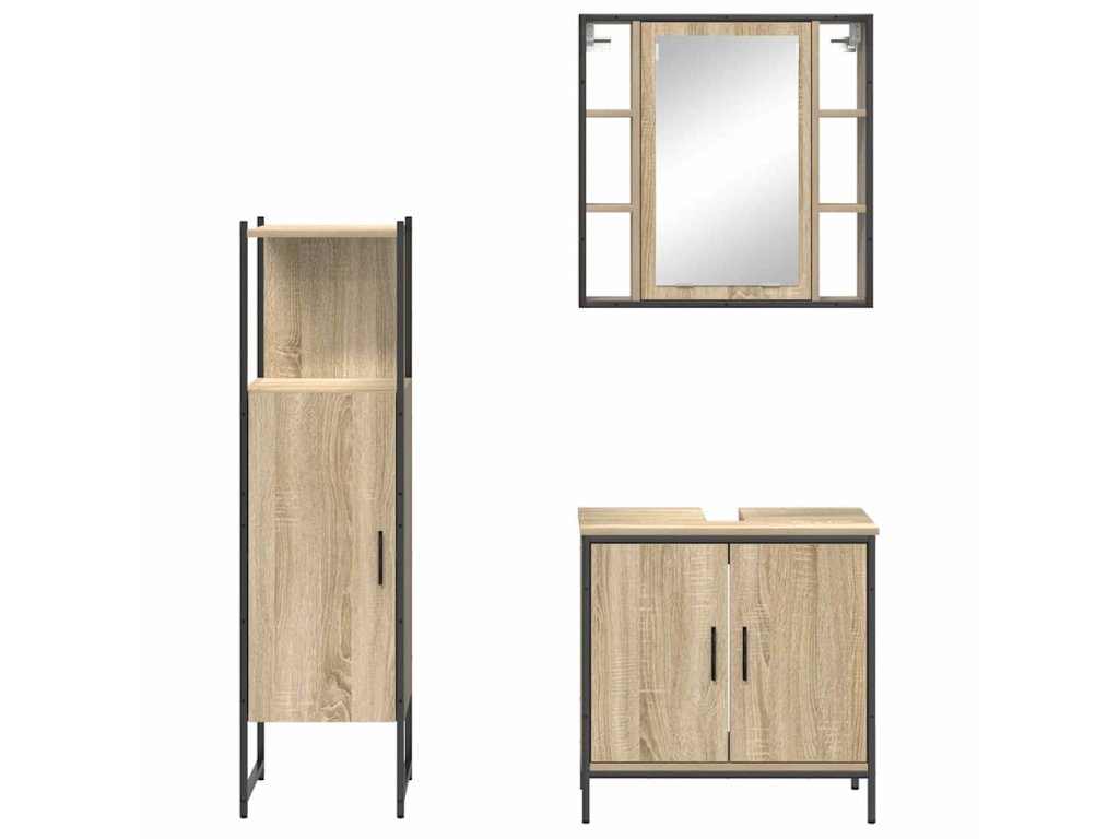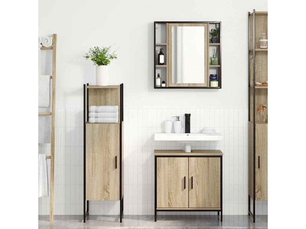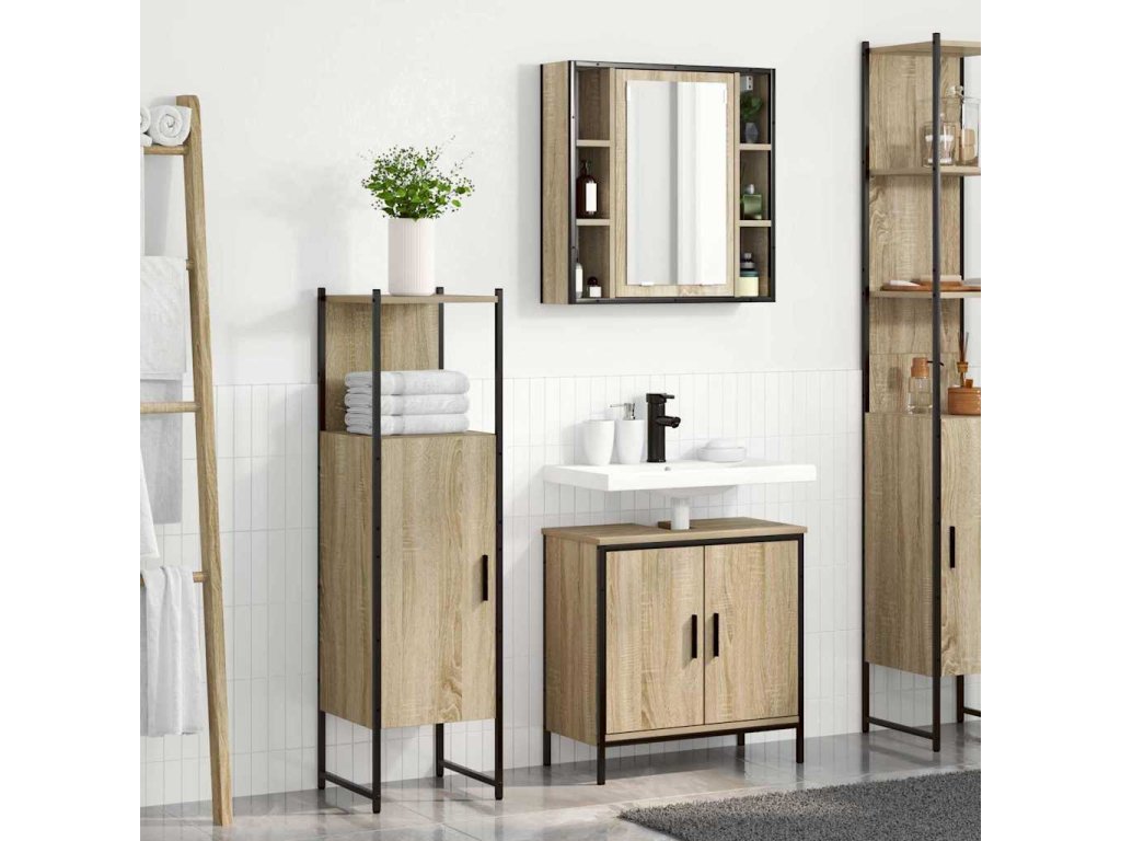 Tato moderní sada koupelnového nábytku je ideální kombinací stylu a užitku, skvěle se hodící do každé koupelny. S elegantními liniemi a minimalistickým vzhledem vytvoří příjemnou atmosféru. Sada zahrnuje zrcadlovou skříňku, skříňku pod umyvadlo a vysokou koupelnovou skříň, každá navržená tak, aby maximálně využila úložný prostor a zároveň vypadala dobře. Materiály jako inženýrské dřevo a ocel dodávají odolnost a moderní estetiku.