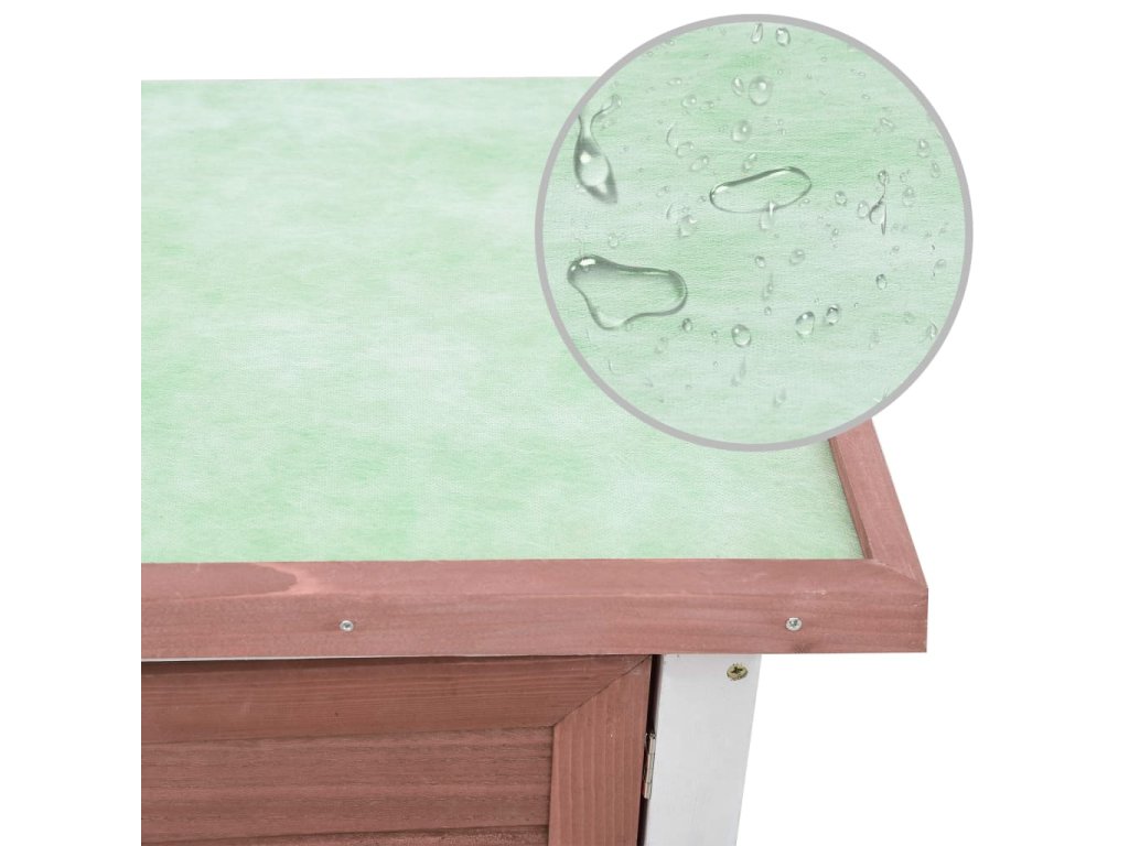 Králíkárna je vyrobená z vysoce kvalitního dřevěného rámu, takže poskytuje pevné a bezpečné přístřeší, které vydrží po celé roky. Její zelená střecha nepropouští déšť a útulný pelíšek uvnitř je skvělý na spaní. Střechu můžete otevřít, abyste své domácí mazlíčky mohli snadno vyjmout nebo vrátit zpět. Z přízemí vede do patra nakloněná rampa, po které se dá snadno vylézt. Výsuvný zásobník usnadňuje čištění. Dvířka se snadno zavírají a dají se zajistit posuvnou západkou.