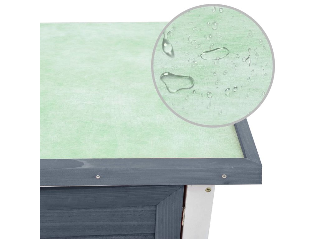 Králíkárna je vyrobená z vysoce kvalitního dřevěného rámu, takže poskytuje pevné a bezpečné přístřeší, které vydrží po celé roky. Její zelená střecha nepropouští déšť a útulný pelíšek uvnitř je skvělý na spaní. Střechu můžete otevřít, abyste své domácí mazlíčky mohli snadno vyjmout nebo vrátit zpět. Z přízemí vede do patra nakloněná rampa, po které se dá snadno vylézt. Výsuvný zásobník usnadňuje čištění. Dvířka se snadno zavírají a dají se zajistit posuvnou západkou.