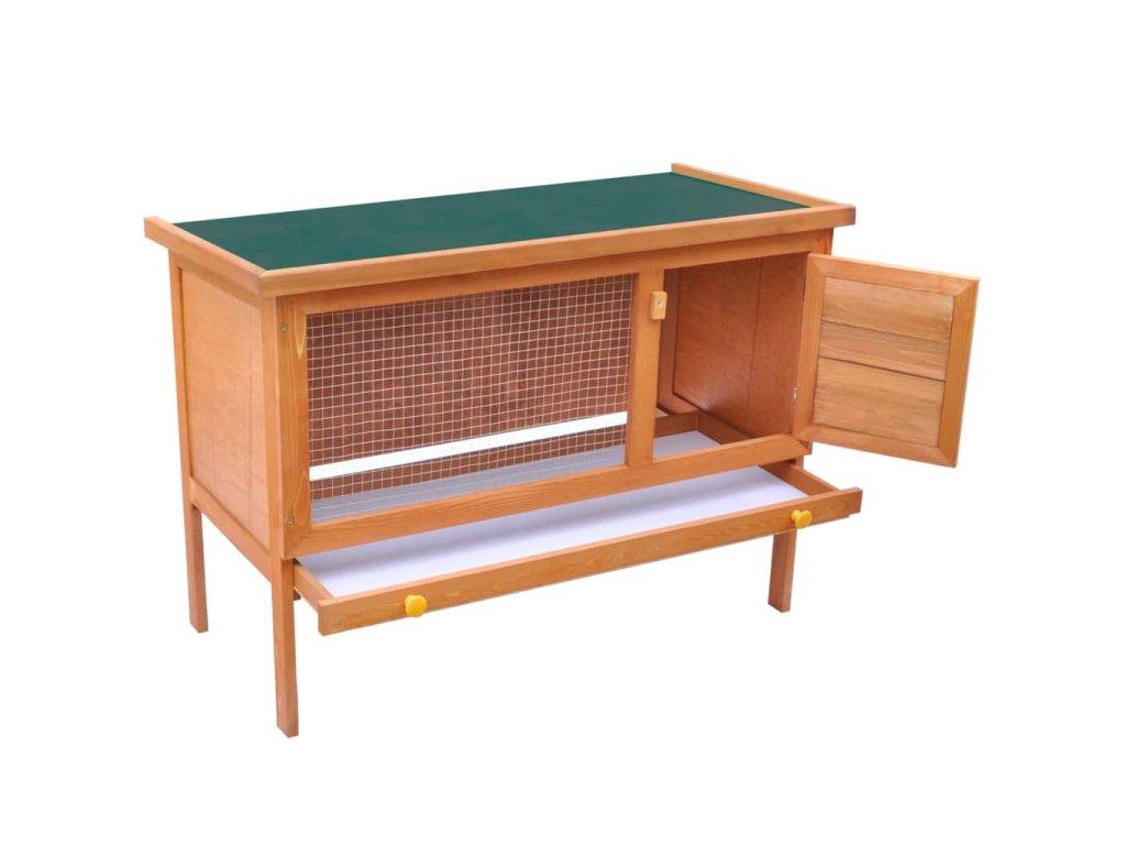 Králíkárna je vyrobena z vysoce kvalitního dřevěného rámu, takže poskytuje pevné a bezpečné přístřeší, které vydrží sloužit dlouhé roky. Její zelená asfaltová střecha nepropouští déšť a útulný pelíšek uvnitř je skvělý na spaní. Střechu můžete otevřít, abyste své domácí mazlíčky mohli snadno vyjmout nebo vrátit zpět. Výsuvný zásobník usnadňuje čištění. Dvířka se snadno zavírají a lze je zajistit posuvnou západkou.