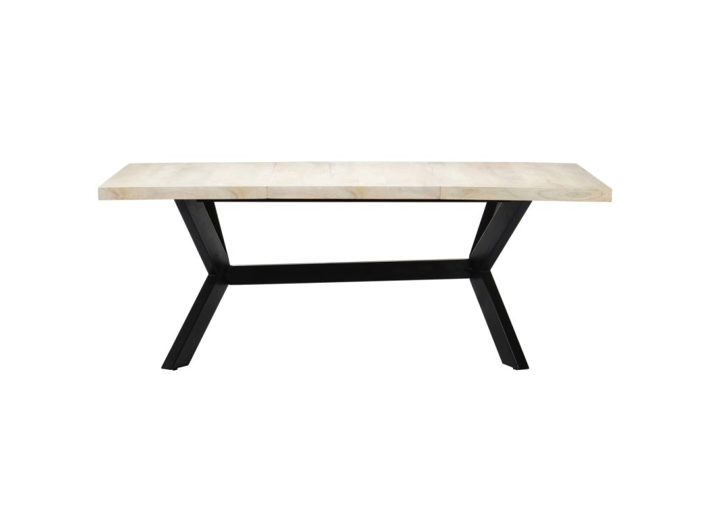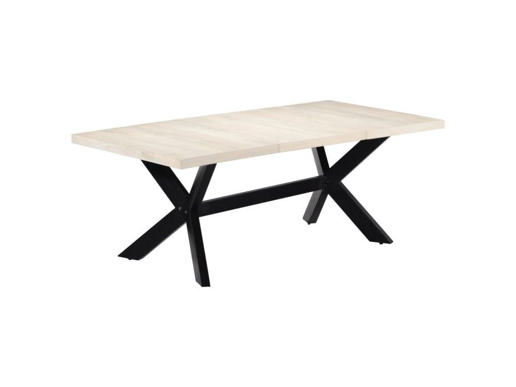 Jídelní stůl je vyroben z masivního mangovníku, což je husté a robustní tvrdé dřevo s povrchem, který se vyznačuje překrásnými hnědými nebo zlatými pruhy a liniemi. Stůl je celý ručně dělaný a každá fáze jeho výroby, včetně bělené povrchové úpravy, je prováděna s mimořádnou péčí. Celkový moderní vzhled stolu završují ocelové nohy, které spolu s ocelovým křížovým rámem přispívají k pevnosti konstrukce.
