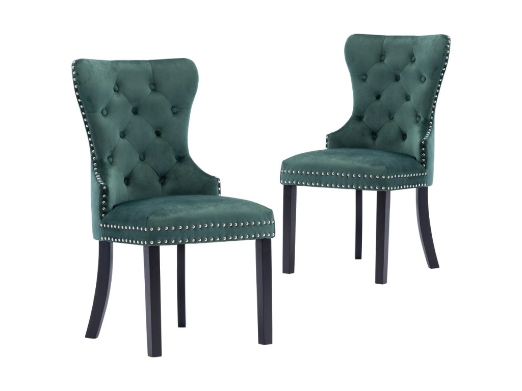 Jídelní židle jsou čalouněné na dotek hebkou sametovou látkou, takže se vám na nich bude moc dobře sedět při stolování, čtení i jen tak u odpočinku. Jejich klasickou krásu zdůrazňují dekorativní knoflíky na opěradle a kovové cvočky podél okrajů. Sedák podepírají nohy z masivního kaučukovníku, židle jsou tedy také stabilní a odolné.