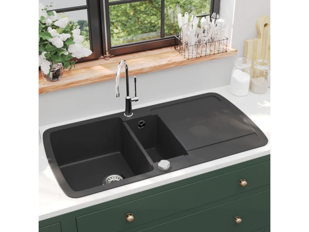 Kuchyňský dřez dvojitý žulový černý 142946