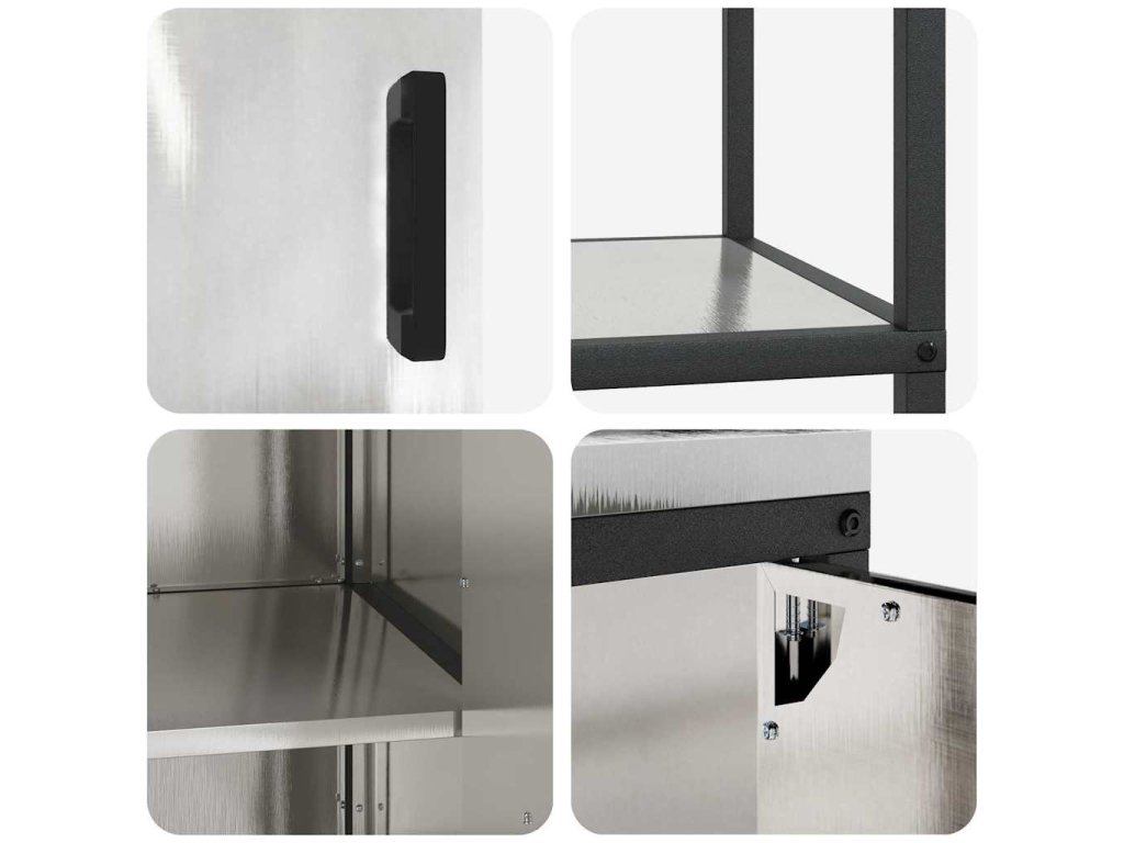 - Součásti: Každý prvek má svůj účel. Ocelový dveře a police zajistí dlouhou životnost a snadný přístup k tomu, co potřebujete. Černý úchyty a nohy laděj s celejma skřínkama i vzhledem, což jí dává elegantní looks. Obdélníkový tvar skvěle šetří prostor a pomáhá efektivně využít kuchyňskou plochu.